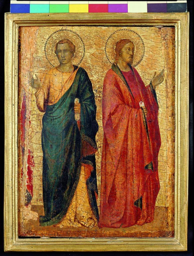 Proprietà della Fondazione Cini, già accostato a Giotto, ma senza alcuna motivazione critica, il dipinto raffigura due personaggi vestiti all'antica, in piedi, probabilmente a colloquio con persone non visibili nella parte superstite della tavola. Secondo Boskovits potrebbe trattarsi degli apostoli Tommaso o Giuda Taddeo (il primo) e di Matteo o Simone (l'altro), parte di una composizione raffigurante i dodici apostoli divisi in gruppi come nella predella del Polittico Stefaneschi di Giotto, oggi nella Pinacoteca Vaticana.