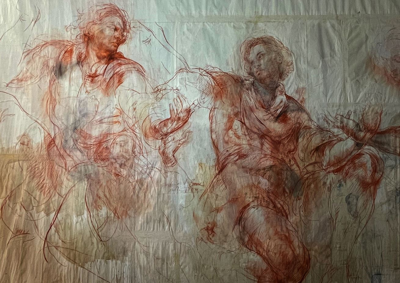 La sua è una pittura che rende sempre omaggio alla pittura, in un rimando colto di citazioni e tributi. In un monumentale disegno a sanguigna, a esempio, si scorge una citazione alle tre figure che compongono la “Primavera” di Botticelli. L’impianto pittorico dell’esposizione si regge su due pilastri: la totemicità di Michelangelo e la velocità del segno di Rubens, da sempre maestri “custodi” dell’artista. Unitamente a quella ridondanza barocca che ne sigilla la cifra stilistica.