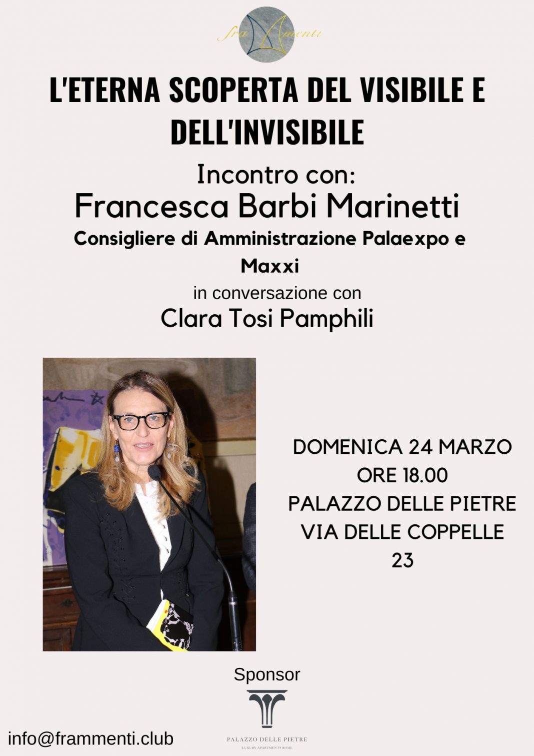 FraMmenti Club continua a tracciare le sue mappe “turistiche” e culturali per una conoscenza rinnovata e profonda di Roma e delle sue storie. Domenica 24 marzo, dalle 18.00 Clara Tosi Pamphili dialogherà con Francesca Barbi Marinetti, membro CdA di MAXXI e Azienda Palaexpo.
