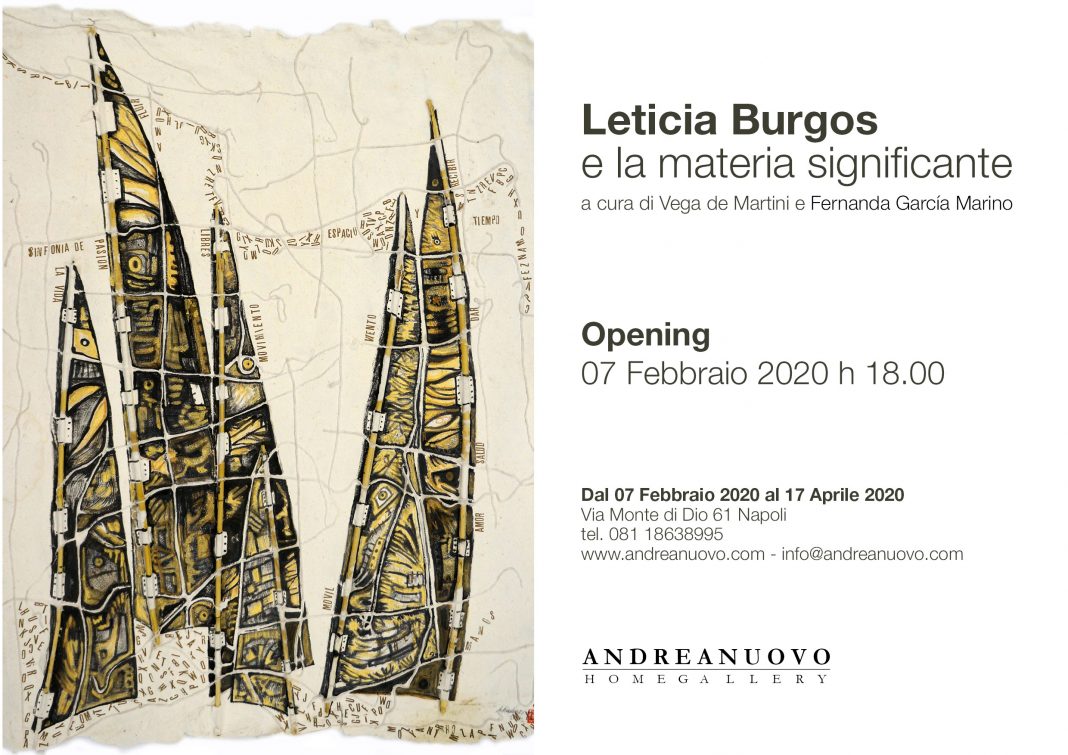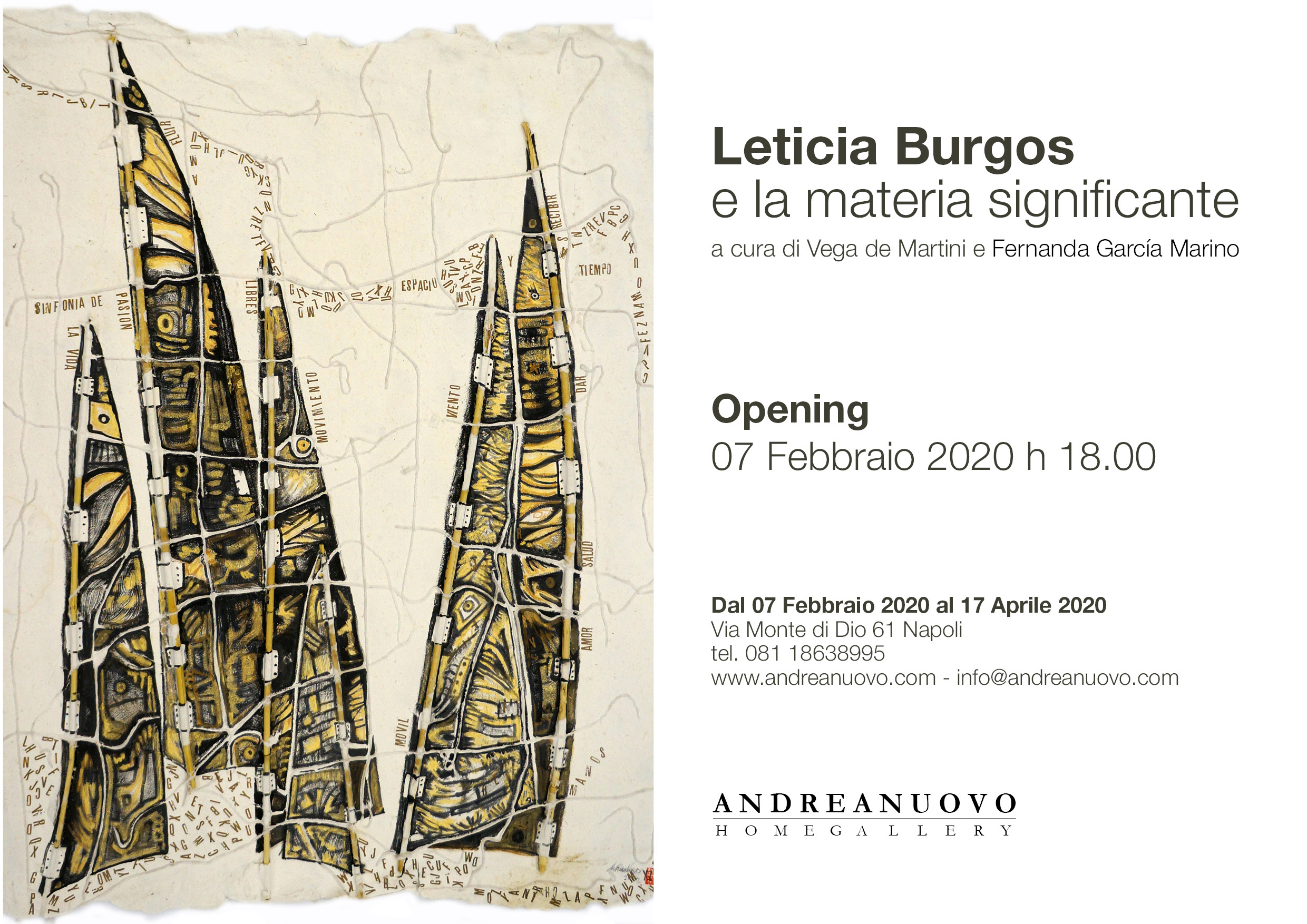 La Andrea Nuovo Home Gallery inaugura a Napoli il giorno 7 febbraio la mostra “Leticia Burgos e la materia significante”, a cura di Vega de Martini e Fernanda Garcia Marino, alle ore 18:00 in via Monte di Dio, 61.