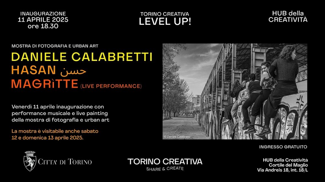 Torino Creativa è felice di annunciare il nuovo LEVEL UP!, l’iniziativa dedicata alla creatività giovanile che si svolgerà nella location dell'HUB della Creatività al Cortile del Maglio (Via Vittorio Andreis 18 – int. 18/L, TO). L'evento inaugurale è previsto in data venerdì 11 aprile alle ore 18.30, con l’apertura di una mostra di fotografia e urban art. Per questa occasione abbiamo il piacere di ospitare, oltre alle opere di Daniele Calabretti e Hasan حسن, la performance musicale del progetto MAGRìTTE, tutti artisti selezionati dalla nostra call Io Sono Creativ*.