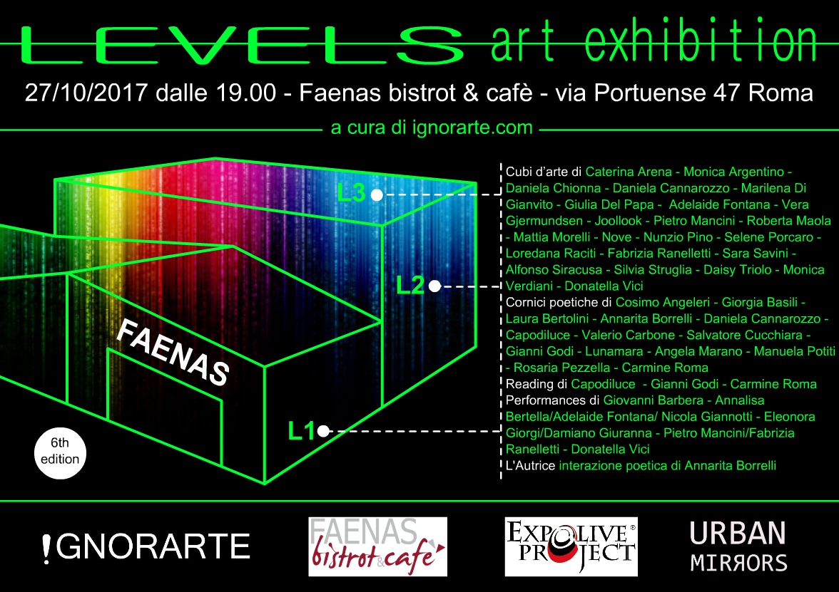 Se la fantasia non è altro che memoria svincolata dall'ordine del tempo e dello spazio, allora l’architettura potrebbe essere considerata come musica cristallizzata in uno spazio condiviso. Questa concezione contaminante viene colta dall'occhio vigile di ignorarte.com in occasione della rassegna “LEVELS” proposta all'interno di Faenas Bistrot & Café, un luogo di aggregazione e offerta culturale nella storica zona di Porta Portese, entrato ormai da tempo a far parte attivamente del processo di sviluppo, riqualificazione e recupero della memoria della zona, un punto di riferimento per condividere il piacere dell’eccellenza eno-gastronomica in accordo con la bellezza dell’arte. Del resto la versione della parola catalana “faenas” è lavoro, creazione, produzione mentale e fisica, quindi ispirazione e saper fare. Dinanzi ad una volontà di convertire lo spazio all'accoglienza dell’arte contemporanea, ignorarte.com, quindi, propone un’idea di distribuzione delle proposizioni artistiche sui tre “livelli” spaziali in cui si sviluppa l’architettura del luogo. Tutti gli artisti partecipanti si possono esprimere in piena libertà, in questo caso senza vincoli tematici. Ognuno apporterà il proprio bagaglio concettuale e tecnico. Pittori, scultori, fotografi, performers, video artists, poeti e musicisti daranno vita alla rassegna.
