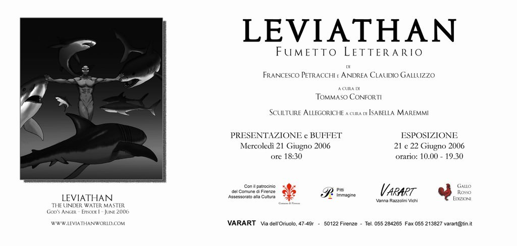 Inconsueto evento collegato alla rassegna Pitti Immagine Uomo e sotto il patrocinio del Comune di Firenze, sarà la presentazione dell’inedito fumetto letterario Leviathan, illustrato da Francesco Petracchi e scritto da Andrea Claudio Galluzzo, che si terrà presso la centralissima galleria d’arte contemporanea Varart diretta da Vanna Razzolini Vichi nelle giornate di mercoledì 21 e giovedì 22 giugno in concomitanza con la kermesse fiorentina della moda maschile. Sostenuta da Simone Siliani, giovane assessore alla cultura di Firenze, questa particolarissima pubblicazione si annuncia come un’avance d’arte completa accostata alla moda grazie all’unione delle illustrazioni con una serie di sculture allegoriche immaginate e vestite dalla stilista Isabella Maremmi.