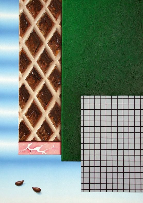 L'ipotesi che l'opera di Lex Vögtli possa far leva su un atteggiamento citazionista un po' acerbo, o una vocazione alla plagio furbamente erudito viene subito smentita, per esempio dalla totale assenza di icone riconoscibili. Non troverete né Marylin Monroe, né la Madonna con bambino e nemmeno le ragazzine dei ritratti di John Currin nell'opera di Lex Vögtli, cosî come non c'é traccia di alcun elemento espressamente simbolico. I soggetti ritratti sono giusto quello che devono apparire: forme e colori in relazione tra loro. Sono le dinamiche che nascono dal loro accostamento a definire il rapporto tra gli oggetti. Lo spettatore deve spogliarsi del suo bagaglio culturale, o per lo meno imparare ad osservarlo da altre angolazioni e, rimettendo in gioco la sua capacità d'astrazione, cogliere il filo sottile che ne costituisce la prospettiva e in fin dei conti la narrazione.