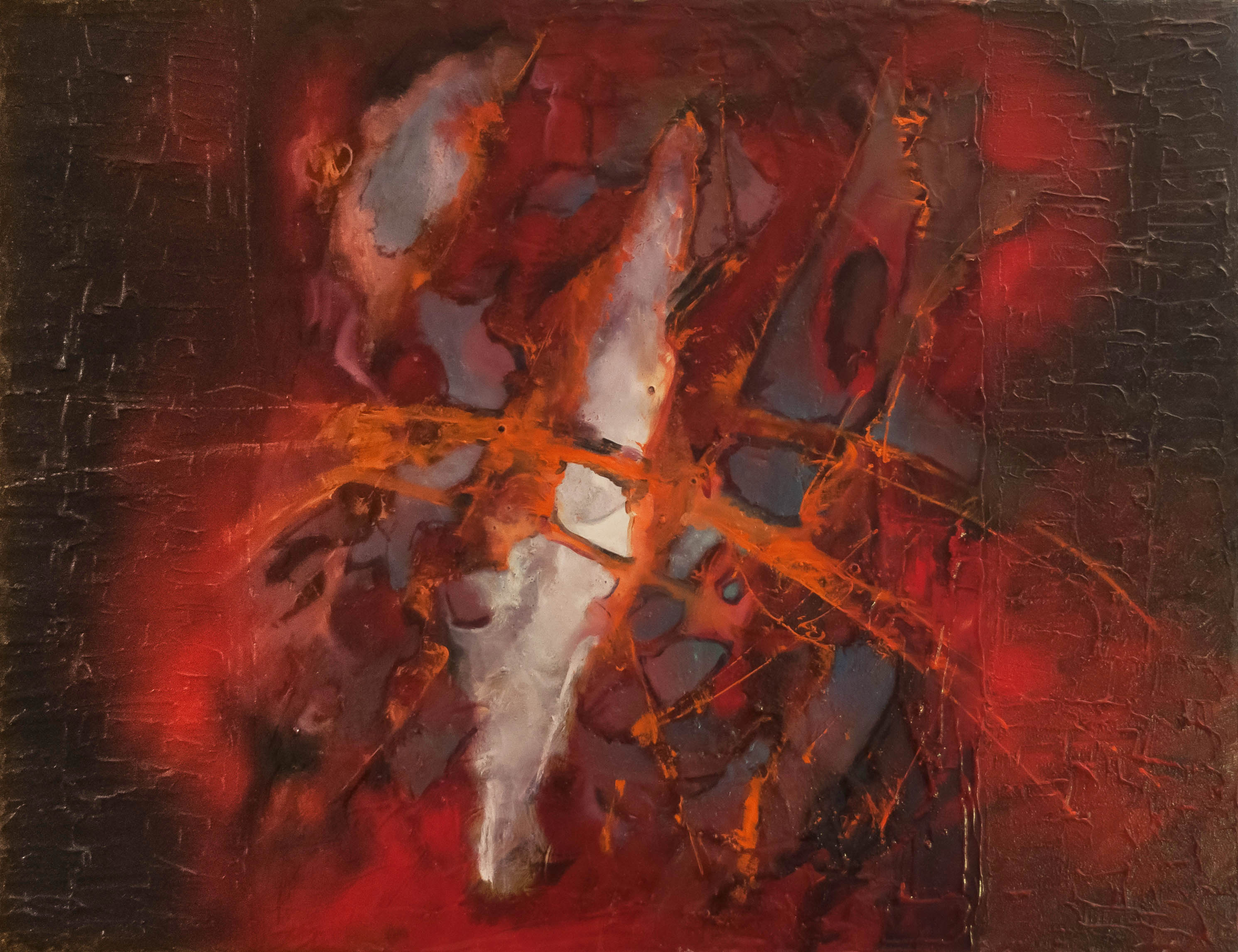 Sprazzi, bagliori di una luce intermittente, radioattiva, illuminano a tratti la materia magmatica e rutilante. Talvolta è un lampo che attraversa lo spazio virtuale del quadro separando zone, zolle, placche telluriche che si contrappongono tra di loro. Altre volte la luce si irradia …