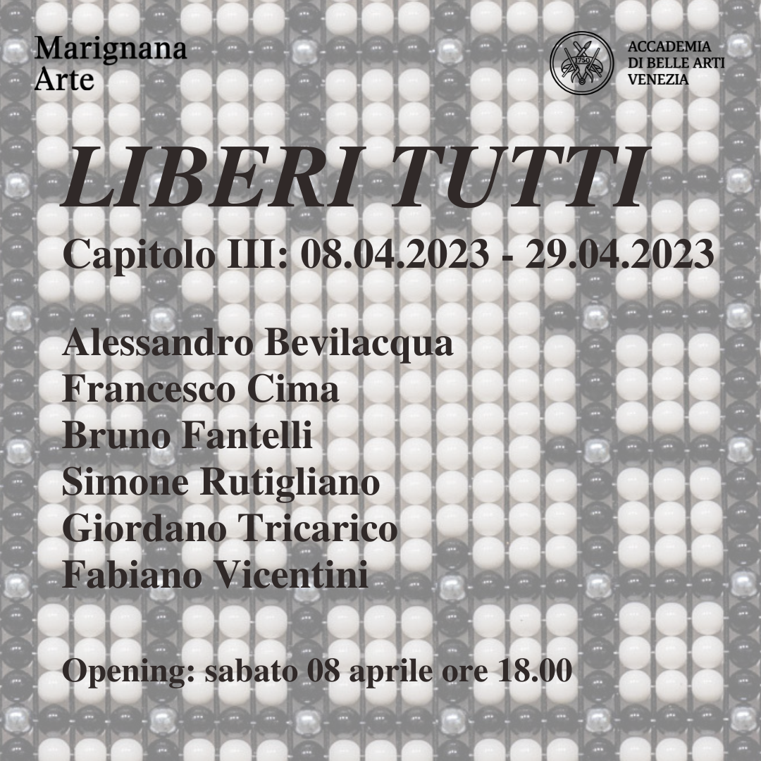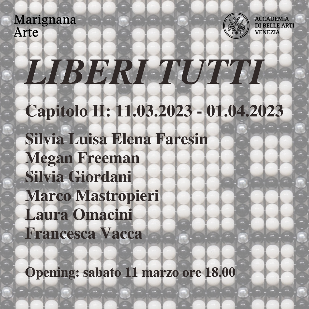 Marignana Arte, in collaborazione con l'Accademia di Belle Arti di Venezia, promuove il progetto intitolato Liberi tutti. L'iniziativa si propone di esporre le opere di diciotto giovani artisti provenienti dagli ateliers dell'Accademia con lo scopo di mostrare gli esiti più recenti delle loro ricerche. Ad ognuno dei tre capitoli in cui è suddivisa l'esposizione (dal 11 febbraio al 4 marzo 2023; dal 11 marzo al 1 aprile 2023; dal 8 aprile al 29 aprile 2023) parteciperanno sei diversi giovani artisti – studenti ed ex studenti dell'Accademia – ciascuno con un proprio lavoro. L'inizio della mostra coinciderà con la presentazione di Luca Massimo Barbero del libro Illusioni. Il tempo è dalla mia parte. Il volume verte sull'opera di Aldo Grazzi, per anni docente dell'Accademia, al quale il titolo dell’esposizione vuole rendere omaggio. Le opere presenti nel volume comprendono anche i lavori con perline esposti da Marignana Arte nella mostra personale di Grazzi intitolata Illusioni, tutt'ora in corso e visitabile fino al 18 febbraio 2023. Da sempre il concetto di arte e quello di libertà vivono in una dialettica inscindibile: da una parte la libertà di sperimentazione teorica e pratica è da sempre condizione necessaria al fare artistico; dall'altra sarebbe impossibile non tener conto della spinta alla libertà che la fruizione stessa dell'opera d'arte da sempre genera. Liberi tutti è in questo senso un progetto che non vuole accomunare forzatamente le opere esposte, ma che cerca piuttosto di esprimere la significazione polisemica – anche in omaggio alla carriera artistica e accademica di Grazzi – sottesa a ricerche diverse condotte da giovani e promettenti artisti. La mostra è un richiamo alla bellezza della libertà della creazione e della fruizione artistica, articolato in tre capitoli, dove saranno presentate le opere dei seguenti artisti: