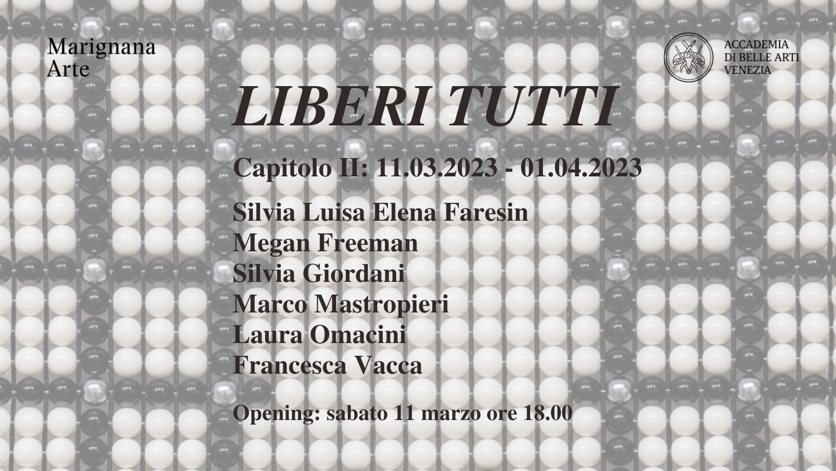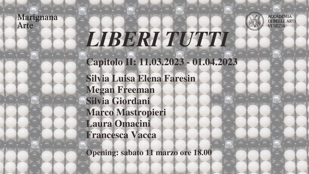 Marignana Arte, in collaborazione con l'Accademia di Belle Arti di Venezia, promuove il progetto intitolato Liberi tutti. L'iniziativa si propone di esporre le opere di diciotto giovani artisti provenienti dagli ateliers dell'Accademia con lo scopo di mostrare gli esiti più recenti delle loro ricerche. Ad ognuno dei tre capitoli in cui è suddivisa l'esposizione (dal 11 febbraio al 4 marzo 2023; dal 11 marzo al 1 aprile 2023; dal 15 aprile al 06 maggio 2023) parteciperanno sei diversi giovani artisti – studenti ed ex studenti dell'Accademia – ciascuno con un proprio lavoro. L'inizio del percorso espositivo ha coinciso con la presentazione del libro Illusioni. Il tempo è dalla mia parte, volume che verte sull'opera di Aldo Grazzi, per anni docente dell'Accademia, al quale il titolo dell’esposizione vuole rendere omaggio.
