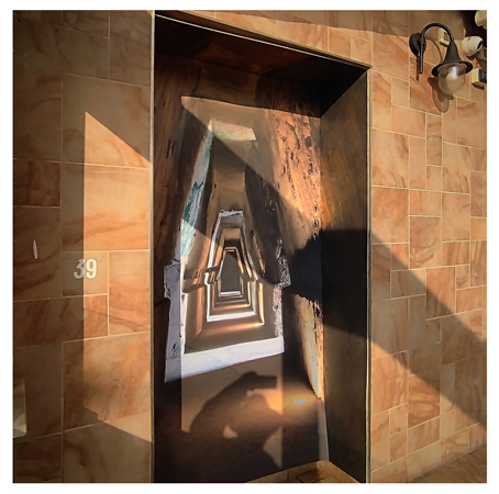 Nel vasto corpus di opere presentate, centrale, a tal proposito, è la sequenza fotografica di 40 tessere 20x20 realizzate da mille punti diversi e installate a occhio dall’artista, in modo tale da permettere a chi l’osserva di cambiarne l’ordine, per un mosaico di particolari composti a svelare molteplici posizioni nel tempo e nello spazio: vedute e prospettive appaiono dall’interno in soggettiva, permettendo di ruotare con lo sguardo sul perno del lato performativo che rimette tutto in gioco, in circolo: autore-spettatore; interno-esterno; soggetto-oggetto; guardare-essere guardati. Occorre la vista di De Cunzo per questo.