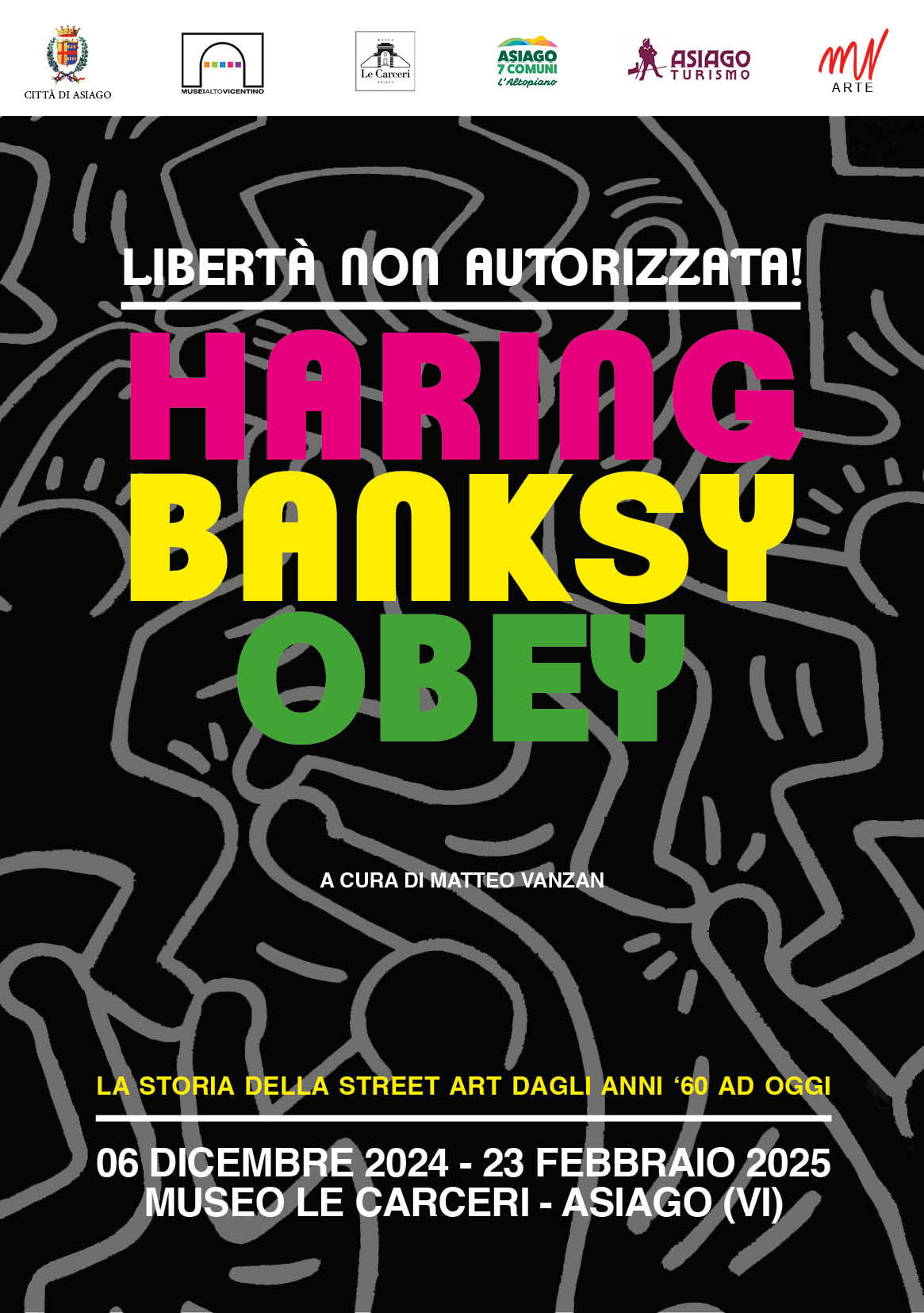 L'Amministrazione Comunale di Asiago (Vi), in collaborazione con l'agenzia MV Arte di Vicenza, presenta la mostra “Haring, Banksy, Obey: libertà non autorizzata” che aprirà al pubblico venerdì 6 dicembre 2024 presso il Museo Le Carceri.