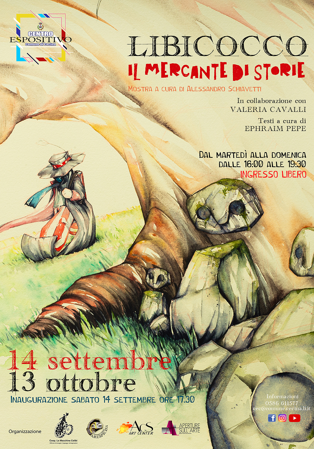 Sabato 14 settembre alle ore 17:30 inaugurerà a Cecina presso le sale del CEC - Centro Espositivo Comunale di Cecina (LI) la mostra ‘Il Mercante di Storie’, personale dell’artista Gian Luca Palazzolo, in arte Libicocco. Saranno esposte numerose illustrazioni e molte tavole che l’artista livornese ha realizzato grazie alla sua variopinta creatività. La mostra, organizzata da Coop Le Macchine Celibi, Associazione Aruspicina e ACS Art Center in collaborazione con la galleria di Casale Monferrato Aperture sull’Arte, è curata da Alessandro Schiavetti, e vedrà in esposizione un corpus importante degli ultimi lavori di Libicocco, incentrati su mondi Fantasy e Fantastici, segno palese di creatività che tende all’onirico tra visioni silvane e mondi incantati.