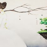 Nei personaggi rappresentati da Libicocco c’è una visione di una società pulita, intonsa, quasi onirica e intesa come obiettivo possibile e auspicabile. Risiede nello sguardo di ogni personaggio quella neutralità ben distante dalle caotiche prigioni meccaniche nelle quali ci adagiamo ogni giorno, e che ci modificano dal nostro più originale nucleo esistenziale. Libicocco ci guida in un viaggio fatto di foreste incantate, di laghi e fiumi silenziosi e ispiratori, costellati da creature pure e sensibili. Una vera boccata d’ossigeno in quel tumultuoso universo che ci digerisce sempre più rapidamente con voracità e rabbia e che ci allontana pericolosamente da madre natura; le linee dei volti sembrano eteree, mai convulse ma raffinate, e spesso assottigliate in un’eleganza indefinibile, mentre i paesaggi verdi e ricchi di vita ci lasciano spaziare con la fantasia tra la cinematografia di fine secolo scorso e i testi dei racconti di David Henry Thoreau. Nel lavoro complesso della mostra dedicata al ‘Mercante di Storie’, la preziosa collaborazione dell’origamista Valeria Cavalli dona impulso alle installazioni pensate per coinvolgere il pubblico nella meticolosa matrice di idee di Palazzolo, mentre i testi realizzati dal regista Ephraim Pepe donano un sussulto romantico a tutta la narrazione.