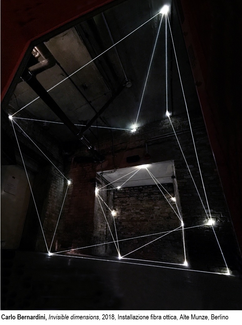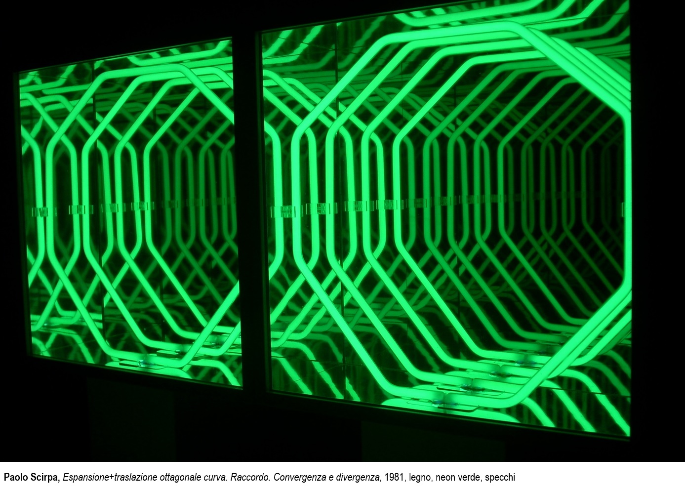Ed è ciò che accade nella stanza oscurata che accoglie le opere luminose di Carlo Bernardini, Giulio De Mitri e Paolo Scirpa, i quali hanno calibrato sapientemente il medium della luce affinché lo spettatore possa comprendere le ricerche da loro intraprese. (…) La luce, come sosteneva Leonardo da Vinci, è energia che crea forme e attraverso la lettura interpretativa di questi tre artisti è possibile percorrere un viaggio che non si limita alla metrica dimensione di una stanza, ma che va oltre le informazioni visive percepite nello spazio circostante, espandendosi in tutto l’ambiente. Ognuno di loro, in maniera singolare, mostra le potenzialità del trinomio luce-spazio-concetto, restituendo un armonioso e totale coinvolgimento.»