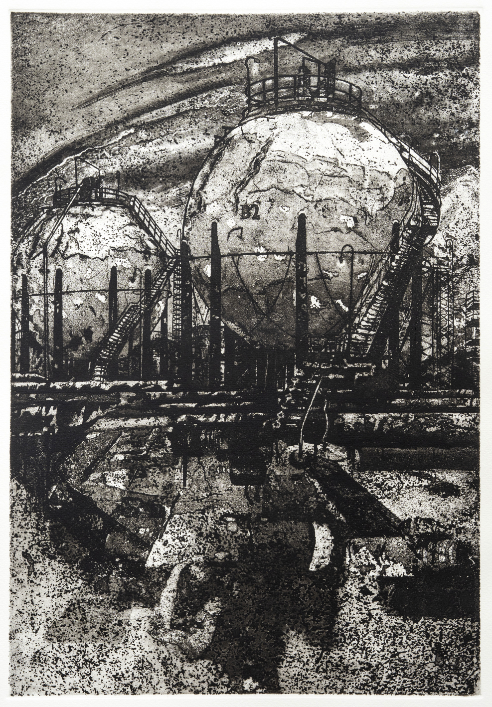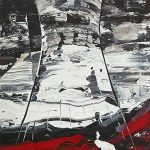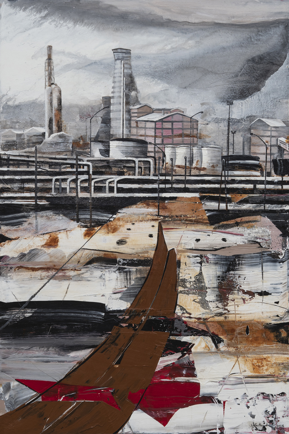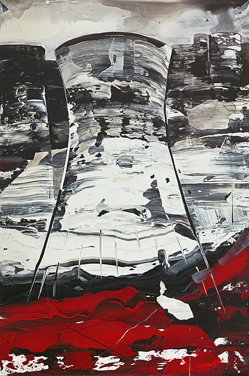 Quando la verticalità è vigorosamente risolta nel bianco e nel nero, essa può essere dichiarata nell’oggettività di un’imponente ciminiera-altoforno, con passaggi che dal crogiuolo del fuoco endogeno attraversano la fascia della combustione e corrosione per giungere alla struttura morfologica di ondulate ipotesi paesaggistiche. Il processo alchemico si conchiude e si schiude nell’incendio interiore di un divenire ciclico di vita-morte-rinascita che è costante palingenesi di energia cosmica. La pittura di Liliana Santandrea che, nonostante la sottesa matrice espressionista, unita a echi munchiani, non ammette confronti o assonanze, induce un’identificazione in grado di sintetizzare sogno e idealità con ragione e concretezza.