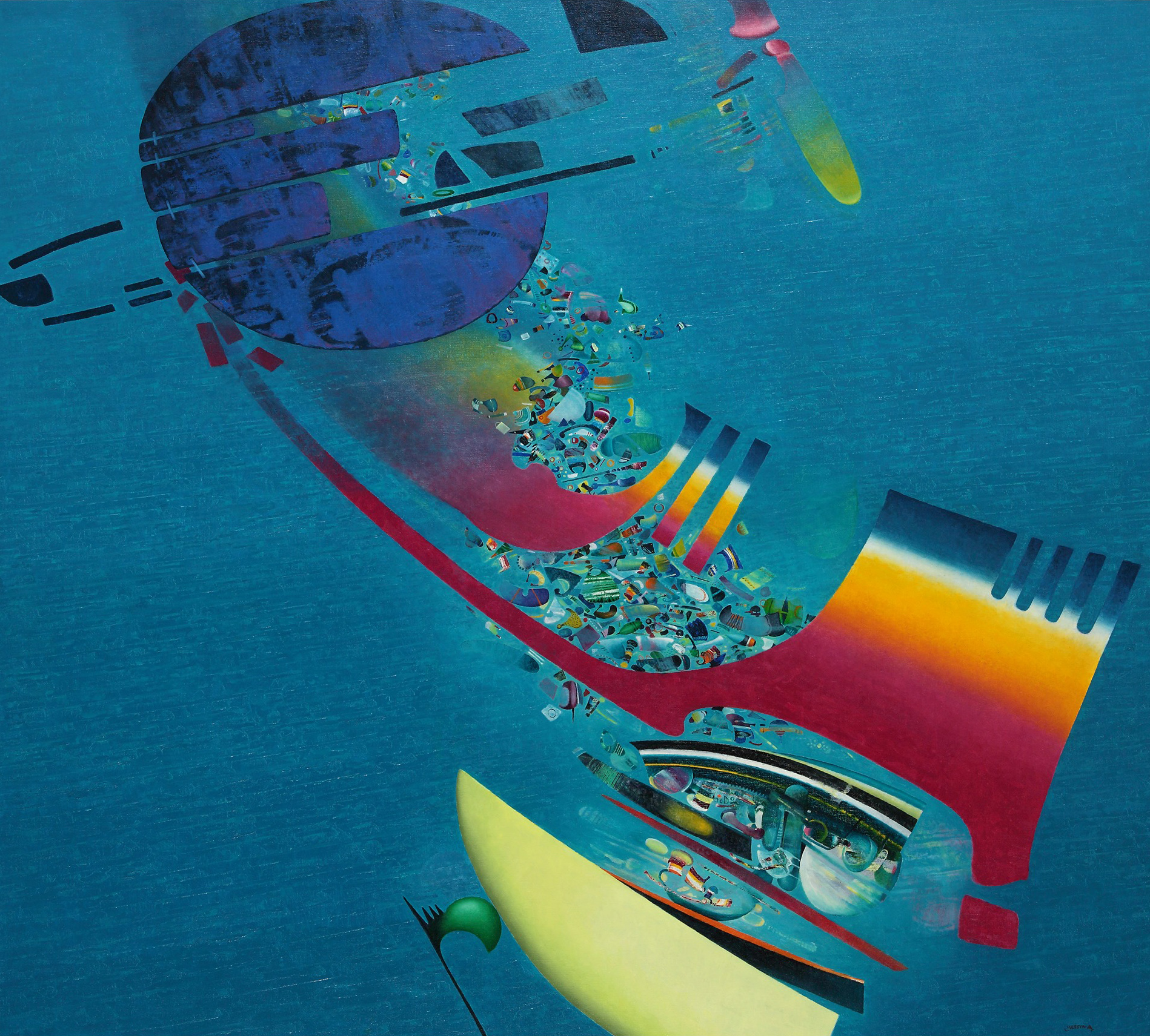 Le nuove isole sono drammaticamente artificiali, fluttuanti, confuse. Ma non è l’isola che non c’è. L’isola di Messina è di legno, una piccola nave o un barcone che prende forme sempre diverse, affiorando con ciò che ne rimane, da un mare che incornicia tutto mantenendo la forza cromatica di sempre. Raccolti tra i resti di quell’imbarcazione, come naufraghi che cercano un appiglio per posare una mano e sentirsi sicuri, decine di oggetti si ammassano uno accanto all’altro in cerca di uno spazio vitale. Ed è qui che esplode la creatività dell’artista. Un’ esplosione che lancia un messaggio che diventa monito e accusa verso tutti noi.