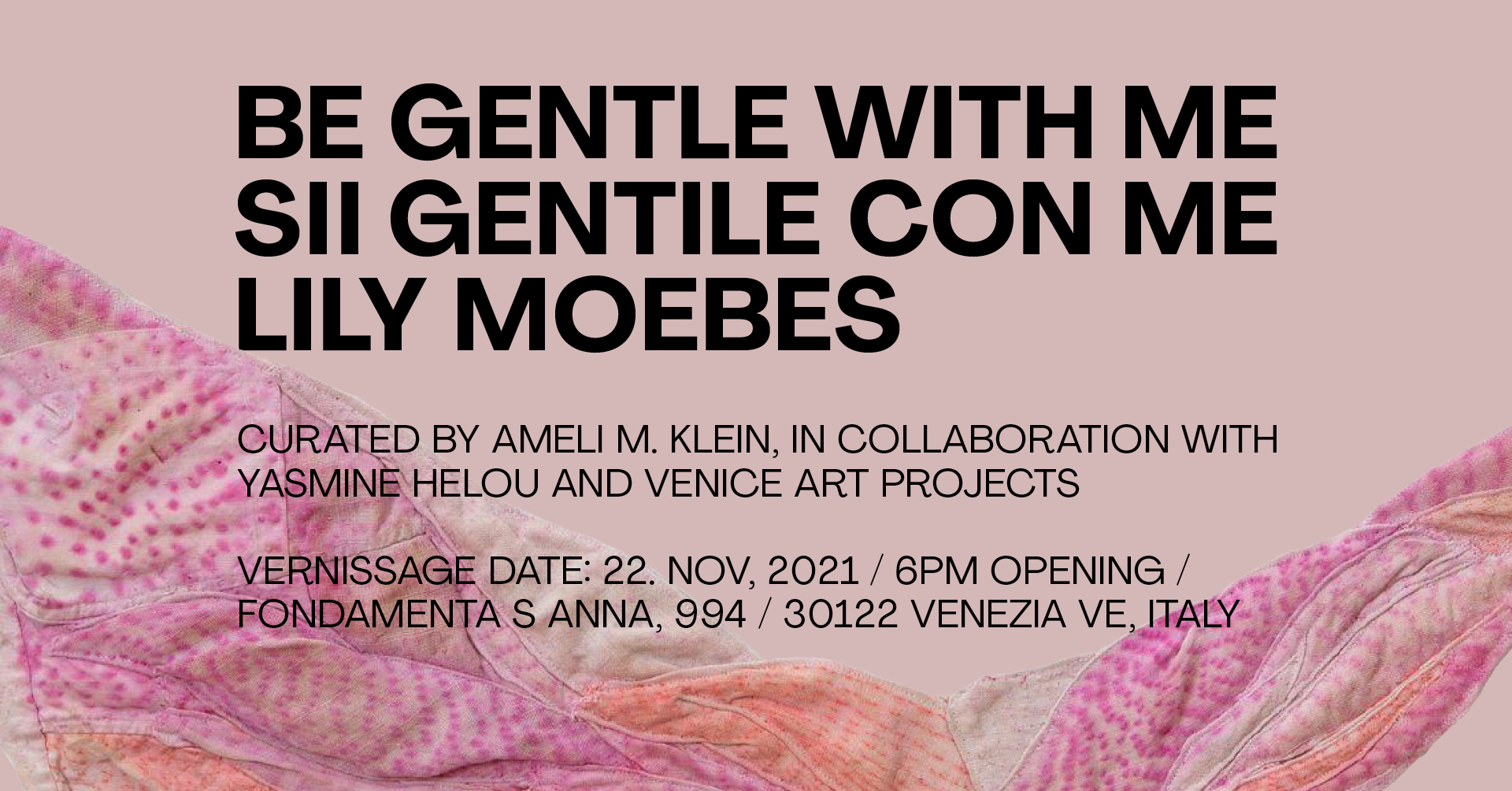 Be Gentle with me – Sii Gentile con me, è la prima mostra personale a Venezia dell’artista, con base a Brooklyn, Lily Moebes. Si tratta d’altronde della sua mostra più esauriente, con una vasta gamma di formati tessili che incorporano pittura, scultura e installazione.