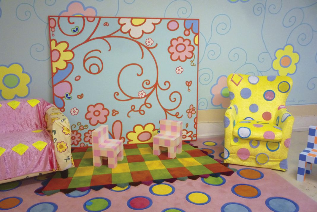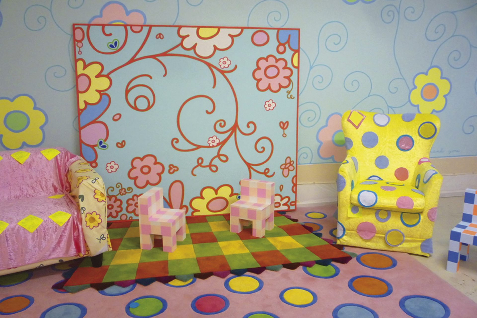 Paintings, sofas, chairs, tables and carpets are overwhelmed by a voluntary childish decoration which recalls a kindergarten and opens doors upon a subversive world made of exuberance, harmony and color.