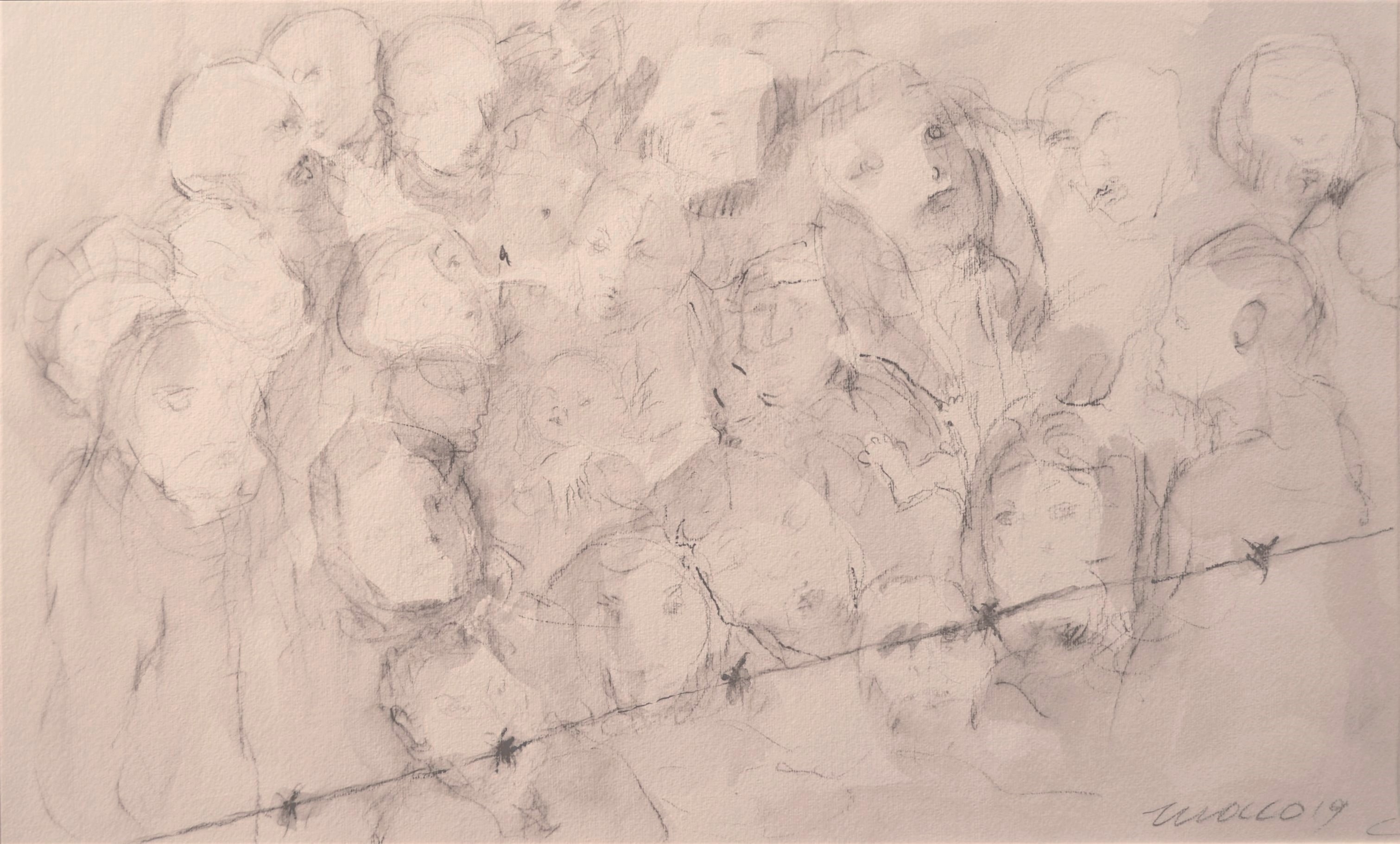 Vincenzo Ruocco, salernitano, nella sua pittura riesce a trattare la gravità di questo tema con leggerezza utilizzando tratti evanescenti e cromie calde. I volti rappresentati si confondono, diventando quasi eterei, impalpabili in contrasto con il ferro acuminato che fa da violento spartiacque tra il desiderio e la possibilità.
