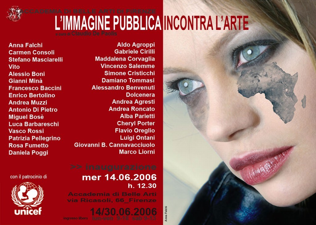L’Accademia di Belle Arti di Firenze a conclusione delle attività didattiche, organizza come ogni anno, l’evento espositivo “Accademia in Mostra”, che raccoglie il meglio della produzione artistica e di ricerca degli studenti dei vari corsi. Quest’anno l’edizione accoglie una iniziativa eccezionale su progetto della scuola di Decorazione del prof. Claudio de Paolis: “L’immagine pubblica incontra l’Arte”. Si tratta di una ricerca sulla ritrattistica operata attraverso i linguaggi artistici contemporanei, come quello della fotografia, realizzata tramite 47 maxi rielaborazioni fotografiche di altrettanti personaggi del mondo della cultura, del cinema, della musica, dello sport, della politica, dello spettacolo. All’iniziativa, patrocinata dall’Unicef,( Regione Toscana) hanno aderito 32 personaggi:
