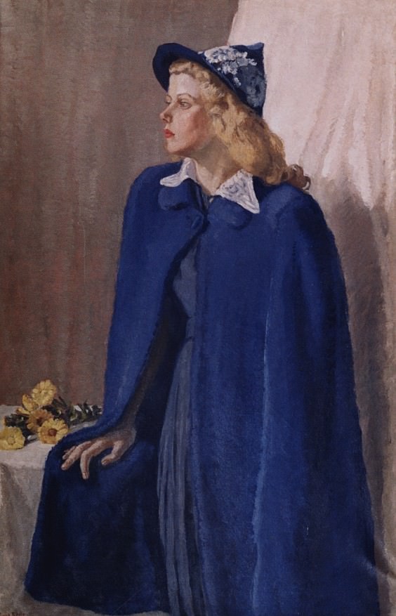 Augusta del 1932, Signora in nero del 1935, Luciana del 1939 Matilde del 1940 sono dipinti ascrivibili a Novecento che offrono, però, l’indicazione di un percorso personalissimo anche all’interno di quell’area stilistica. Cioè, se da una parte la robustezza d’impianto e la saldezza compositiva sono matrici che si possono agevolmente riferire al movimento in questione, è altrettanto vero che la propensione al colore pieno riscatta quelle forme diventando in definitiva il dato saliente della sua pittura. In Matilde, per esempio, la grande suggestione del ritratto deriva dalla modulazione del colore azzurro dell’abito, protagonista assoluto del dipinto, reso intensissimo dalla vicinanza del piccolo mazzo di fiori giallo.