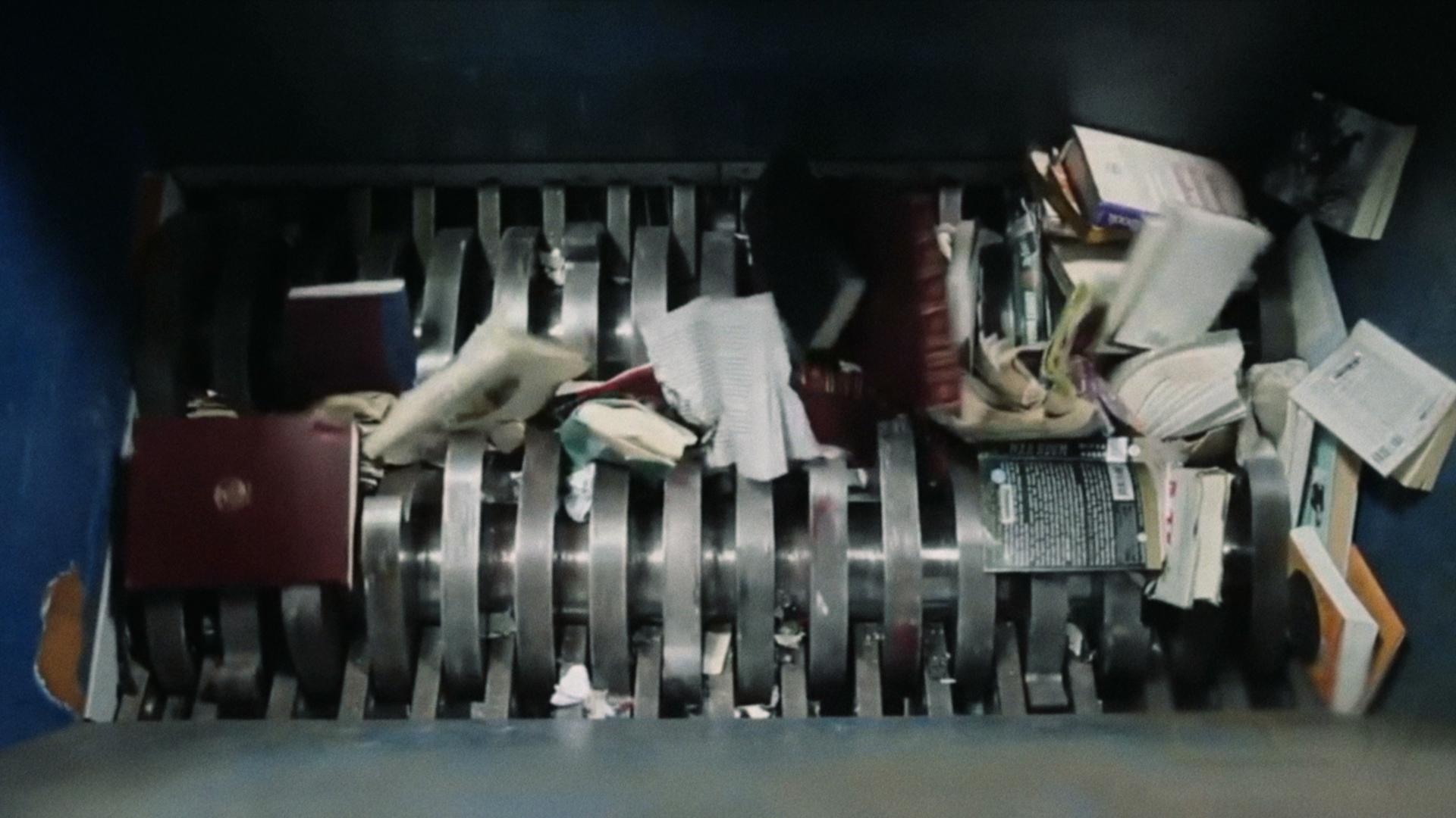 In Diagram of Transfer No.1 l'attenzione dello spettatore viene subito catturata da una rumorosa macchina distruggi libri. Alcuni titoli si riescono