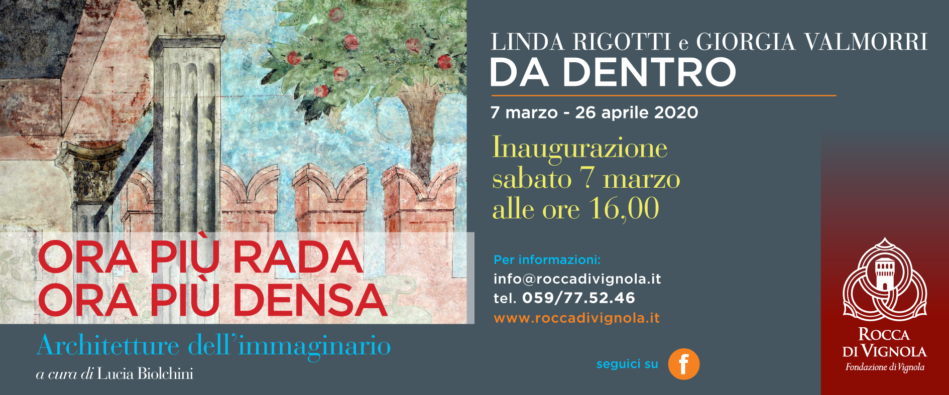 Fino al 26 aprile 2020 la Fondazione di Vignola ospita “Ora più rada ora più densa. Architetture dell’immaginario”, una rassegna di arte contemporanea a cura di Lucia Biolchini tra le mura della storica Rocca. Dopo Marina Fulgeri, Sabrina Muzi e Alessandro Moreschini, a partire da sabato 7 marzo e fino al 26 aprile prende il via la mostra di Linda Rigotti e Giorgia Valmorri, ultima tappa del percorso espositivo che ha proposto il confronto tra esperienze contemporanee e spazi antichi dallo scorso luglio. Il programma completo è scaricabile qui.