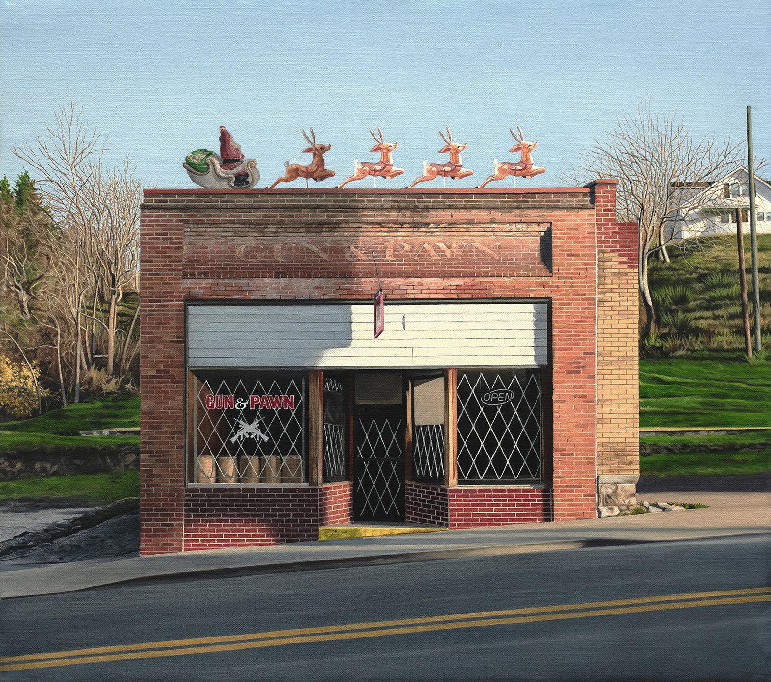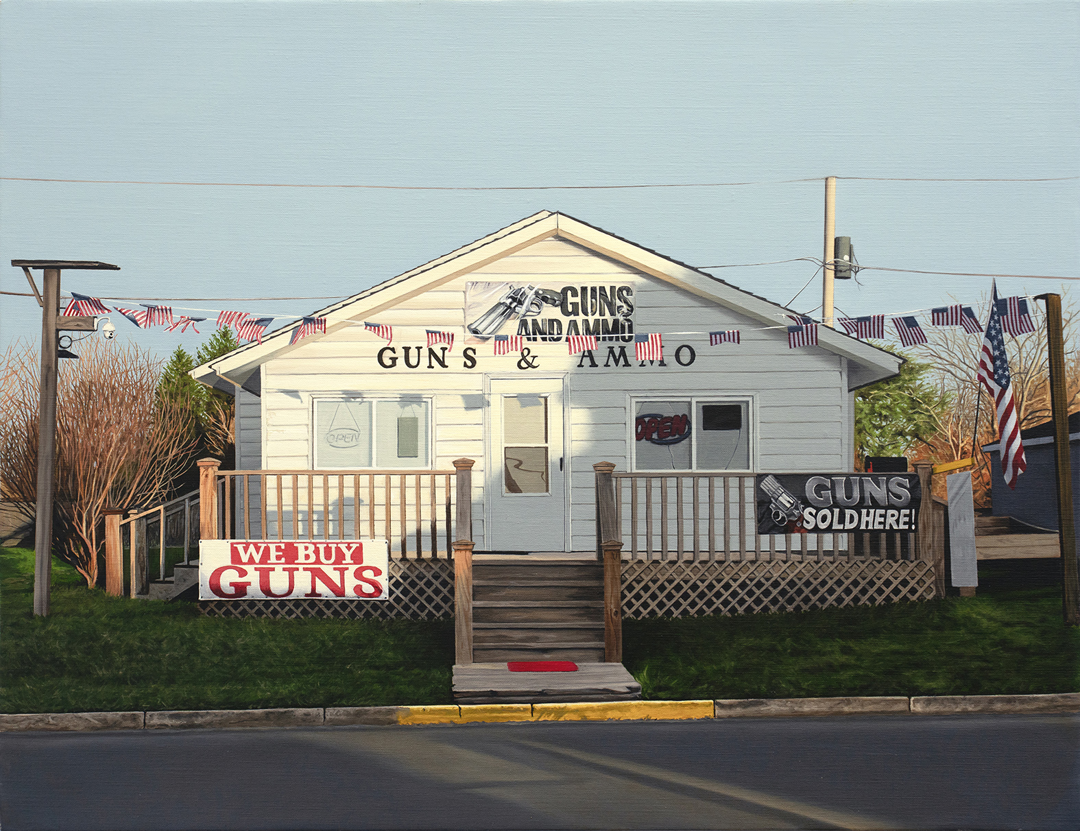 I dipinti a olio presentano scene della città natale dell’artista nel West Virginia richiamando i lavori del pittore Precisionista americano George Ault (1891 - 1948), sia per lo stile dettagliato e distaccato, sia per la loro austera rappresentazione dell’America pastorale. In Crosses, tre croci scure si ergono accanto a un palo della luce sul fianco di una collina altrimenti anonima; in Fire un enorme camper brucia sul ciglio della strada, il veicolo annerito sprigiona pennacchi di fumo tossico in un cielo blu. We Buy Guns ritrae un negozio di armi presente nel suo quartiere: quella che in origine era una casa è stata trasformata in una rivendita di armi e munizioni. Addobbata con una serie di bandierine americane di plastica e cartelli in vinile, pubblicizza la merce in vendita con un tale entusiasmo che il potenziale di violenza disponibile sembra una promessa.