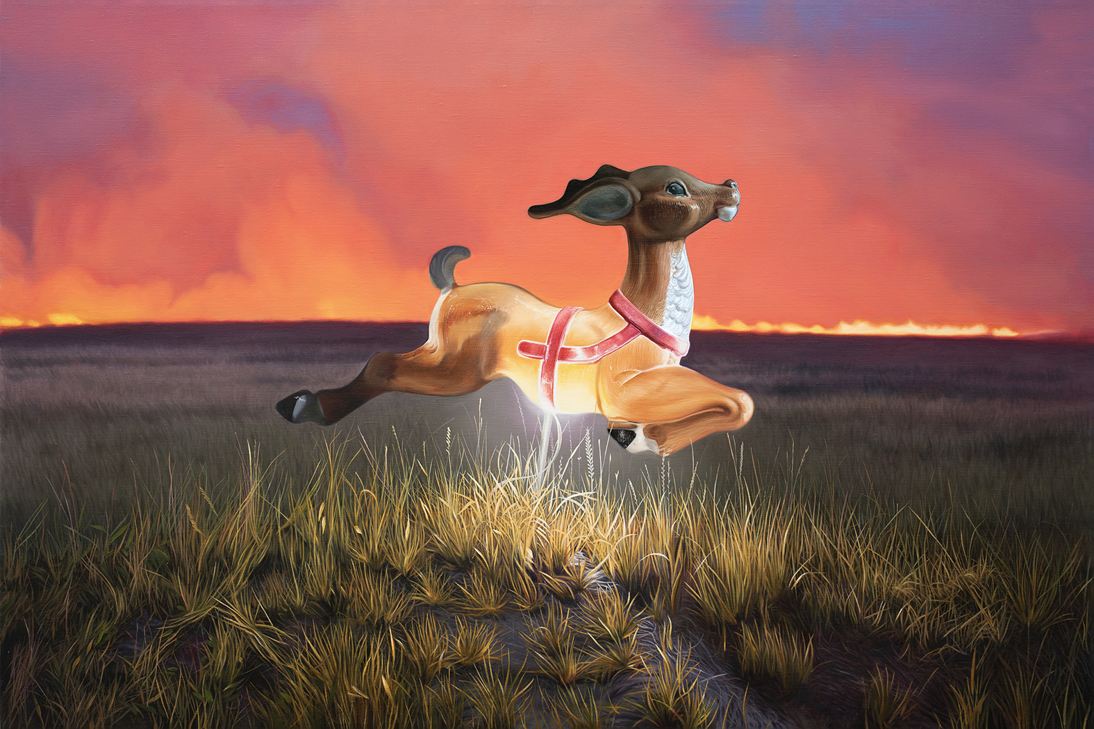 Le figure in plastica modellata e stampata, presenti in tutta le opere, sono palesemente prive della loro caratteristica luminosità, eccezion fatta per il soggetto dell’opera dal titolo appropriato Shine (Splendore). Qui, Merrill reinterpreta La Guerra (1984) di Henri Rousseau, trasformando la protagonista femminile in una renna di plastica che galoppa in un prato con sullo sfondo un orizzonte infuocato. La figura luminosa e in movimento ha un’autonomia e una consapevolezza di sé che manca alle figure presenti nelle altre opere di Merrill, eppure offre ben poche soluzioni concrete di fronte alle fiamme che avanzano.