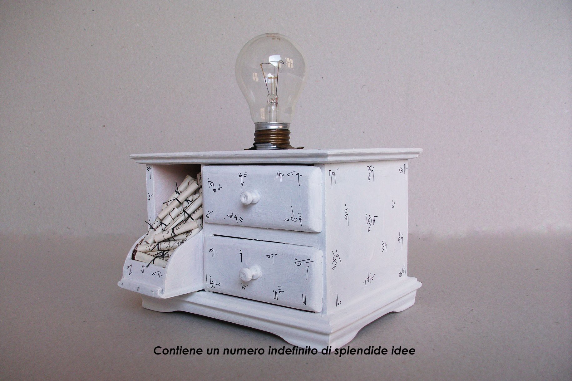 Ogni oggetto è corredato da un titolo/racconto , che è rigorosamente parte dell’opera e ne completa il senso. L’insieme delle creazioni esposte realizza e illustra una storia con più episodi e sfaccettature; è una metafora della nostra esistenza, nella sua quotidianità e dei nostri pensieri più reconditi e trascurati. L’artista usa abilmente le parole, smonta le frasi fatte e gli abusati modi di dire, concretizzandoli in un oggetto o svelandone le contraddizioni in un gioco surreale.