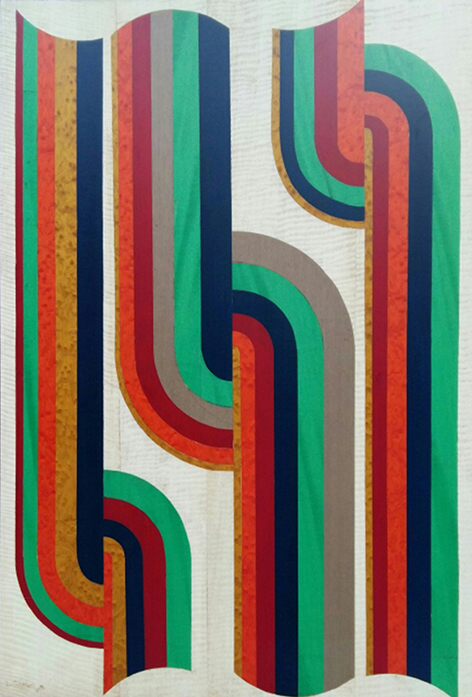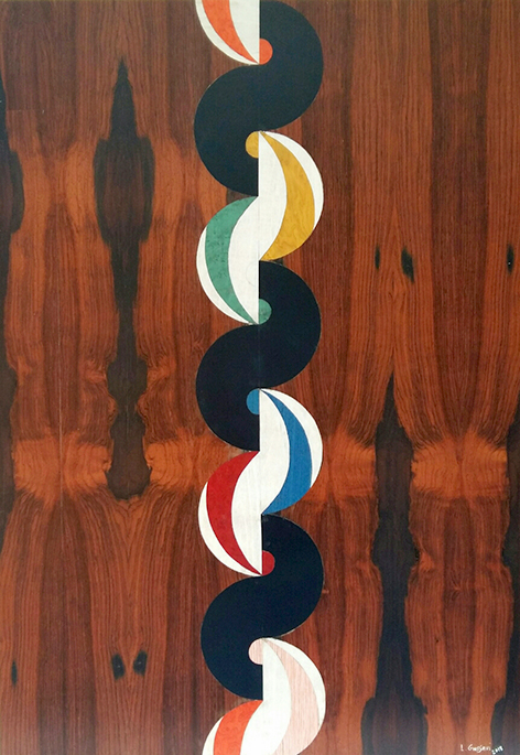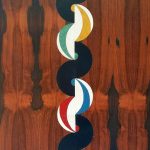 Nelle sue mani i sottili fogli di legno dai più diversi colori e dalle più svariate venature, si compongono “a mosaico” fino ad ottenere preziose superfici, testimoni di un alto magistero e di una vera e robusta ispirazione.