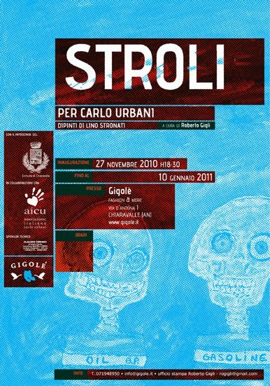 Si apre venerdì 27 novembre, ore 18,30, alla Rotonda del Gigolè di Chiaravalle (An) la personale di pittura di Lino Stronati, in arte Stroli, che l’artista di Jesi dedica alla figura di Carlo Urbani, Medico senza Frontiere marchigiano scomparso nel 2003 dopo aver bloccato l’epidemia di Sars. In esposizione, fino al 10 gennaio 2011, trenta originali opere con le quali Stroli sintetizza in un unico evento la sua irrefrenabile verve artistica, in un veloce passaggio tra diversi stili fino all’attuale espressionismo concettuale. Sì perché Stroli è un “giovane” artista autodidatta di sessanta anni che, ripresi tavolozza e pennelli, brucia le tappe di quella sperimentazione sospesa nel tempo ma mai dimenticata. E allora è vulcanica la forza creativa che ne deriva, e decisamente originale, come la descrive nel suo intervento la critica d’arte Martina Mancinelli definendo l’opera di Stronati portatrice di “un […] linguaggio senz’altro Naif ma al tempo stesso sorprendente nell’utilizzo sapiente e disinvolto del colore e nei suoi scaltri riferimenti alla storia della pittura. Alle belle forme l’artista aggiunge tuttavia anche i contenuti: una lunga riflessione sull’uomo e sulla società contemporanea […] il pessimismo che potremmo cogliere in alcuni lavori è solo di superficie: guardando più in profondità scopriremo che Stroli ci parla con amore e speranza dell’uomo, indicandoci più qualcosa da riscoprire – il contatto con la natura, una certa spiritualità – anziché qualcosa che sembrerebbe perso”.