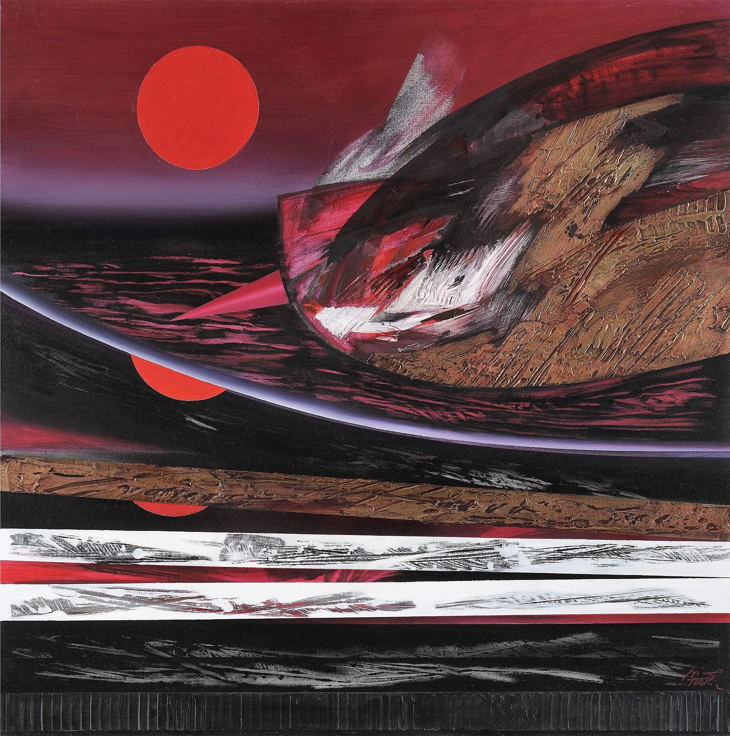 Nel saggio pubblicato in catalogo, Franco Campegiani ci ricorda che le opere di Lino Tardia sono “vere e proprie scatole dei miti che, come calamite, attraggono elementi eterogenei, caricandoli di contenuti psichici straordinari. Vi entra di tutto: lune, soli, astri e satelliti, unitamente a cenni antropomorfi e a echi cronachistici, a stralci di giornale. Il tutto dipinto e non incollato, in quanto solo il colore e il pennello, per Tardia, hanno diritto di cittadinanza nel quadro”.