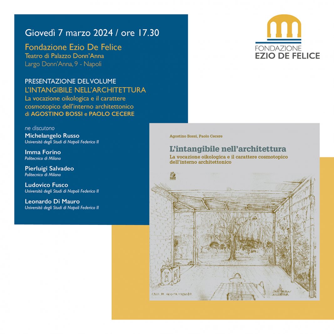 Giovedì 7 marzo alle ore 17.30 a Palazzo Donn’Anna la Fondazione Ezio De Felice presenta il libro “L'intangibile nell'architettura - La vocazione oikologica e il carattere cosmotopico dell'interno architettonico” di Agostino Bossi e Paolo Cecere, pubblicato da CLEAN edizioni.