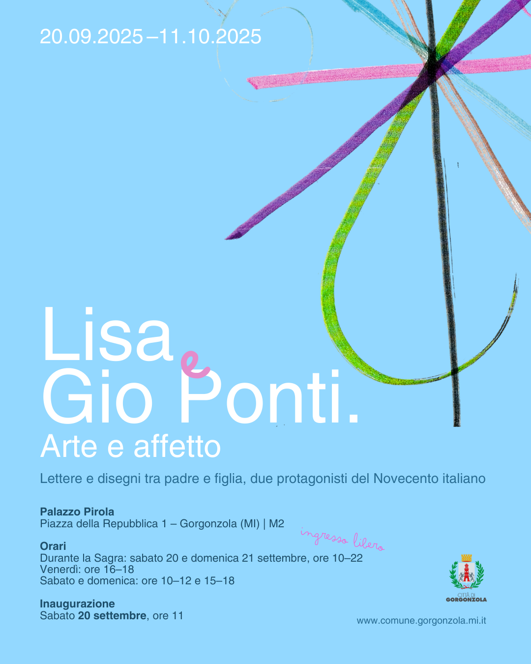 Dal 20 settembre all’11 ottobre 2025, Palazzo Pirola di Gorgonzola ospita la mostra Lisa e Gio Ponti. Arte e affetto. L’esposizione presenta una selezione di lettere autografe di Gio Ponti e oltre 80 disegni originali di Lisa Ponti, mettendo in luce il dialogo creativo e affettivo tra padre e figlia, due protagonisti del Novecento italiano. L’iniziativa si inserisce nel programma culturale della città in occasione della tradizionale Sagra del Gorgonzola.