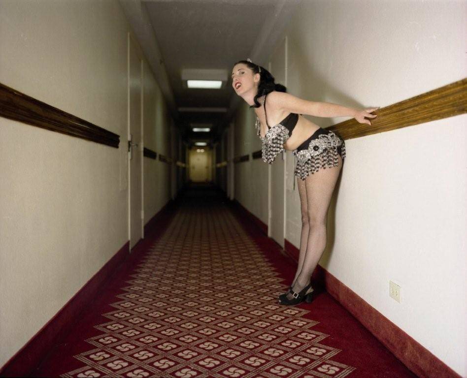 Lo stile del burlesque fa rivivere l’arte dello strip-tease come gioco provocatorio: le ballerine ritratte sono spogliarelliste sui generis, performer vicine all’immaginario delle pin-up che danno vita a uno spettacolo fatto di piume, lustrini e trucchi di scena. Alle immagini vibranti e vitali delle showgirl fanno da contrappunto quelle degli interni vuoti, che raccontano di tappeti logori, neon colorati, sagome femminili nude ritratte a mano sulle pareti e mozziconi di sigarette. Lontana dall’intento documentaristico, Kereszi si concede un sentimento nostalgico, un vivo desiderio di rappresentare qualcosa che forse esiste solo nell’immaginazione.