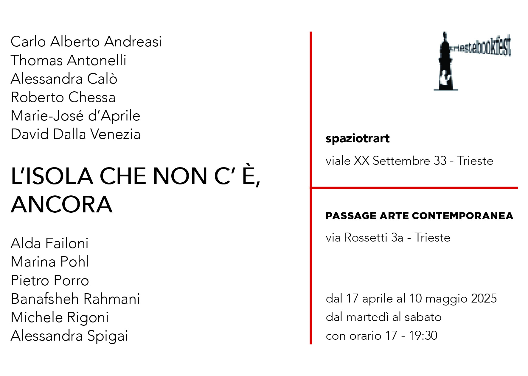 Dodici artisti: Carlo Alberto Andreasi, Alessandra Calò, Roberto Chessa, Maria-Josè d’Aprile, David Dalla Venezia, Alda Failoni, Marina Pohl, Pietro Porro, Banafsheh Rahmani, Michele Rigoni, Alessandra Spigai.