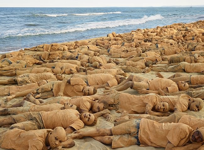 In un linguaggio unico in cui fonde perfomance e protesta, Liu Bolin è arrivato in Sicilia, a Mineo, dove ha dato vita alla sua serie Migrants, incentrata sui processi migratori che dall’Africa vedono partire migliaia di persone ogni settimana verso l’Europa