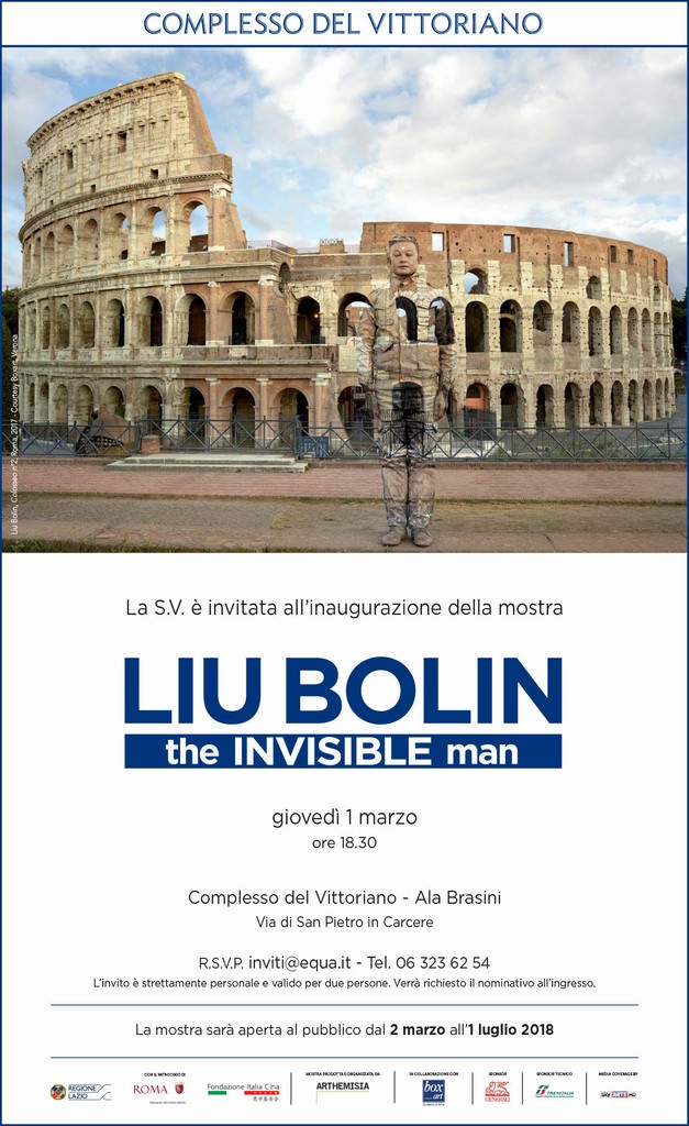 Dal 2 marzo all'1 luglio il Complesso del Vittoriano, nella Capitale, ospiterà la mostra 'Liu Bolin the Invisible man'. Liu Bolin, l’artista di origine cinese e definito 'l'uomo invisibile', ha raggiunto la fama internazionale come colui che ha fatto del camouflage il suo tratto distintivo. Rimanendo immobile come una scultura vivente, Bolin integra il suo corpo con il contesto alle sue spalle grazie a un accurato body-painting e infine si fa fotografare. Nell'Ala Brasini del Vittoriano saranno così presentati al pubblico una serie di scatti realizzati nel 2017 tra i marmi dell’Anfiteatro Flavio e le forme barocche della Reggia di Caserta, insieme a 70 fotografie frutto di dieci anni di lavoro in collaborazione con la Galleria Boxart.