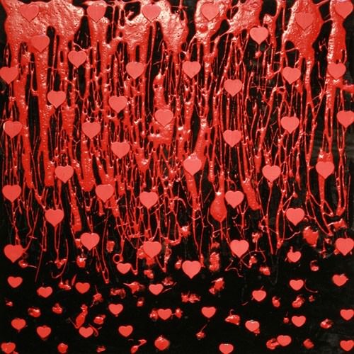 Guardi i quadri di Sakurai: vedi tanti cuoricini rossi in rilievo e dietro colori vivaci, il tutto ricoperto da vinavil. Pensi sia un giochino artistico che produce gradevoli effetti visivi, come le vetrine nel giorno di San Valentino. Poi però scopri che i colori vivaci dietro ai cuoricini sono ottenuti con metodo shibori, antica e complessa tecnica di tintura che permette di realizzare raffinate e ogni volta diverse screziature con ricche gamme cromatiche .arlandogli scopri che Shinya Sakurai ò pacifista, curioso e attento ai fenomeni sociali correnti, giapponesi e non, e ha tanti amici anche qui in Italia, come il fotografo Turi Rapisarda e il pittore Giuseppe