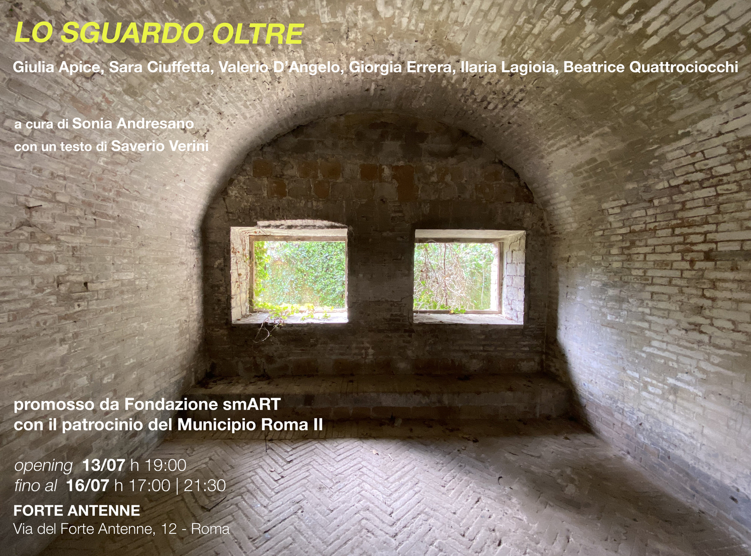 Fondazione smART presenta , presso gli spazi del Forte Antenne, Lo sguardo oltre, collettiva che coinvolge sei giovani artisti, Giulia Apice, Sara Ciuffetta, Valerio D’Angelo, Giorgia Errera, Ilaria Lagioia, Beatrice Quattrociocchi, a conclusione di un progetto didattico a cura di Sonia Andresano.