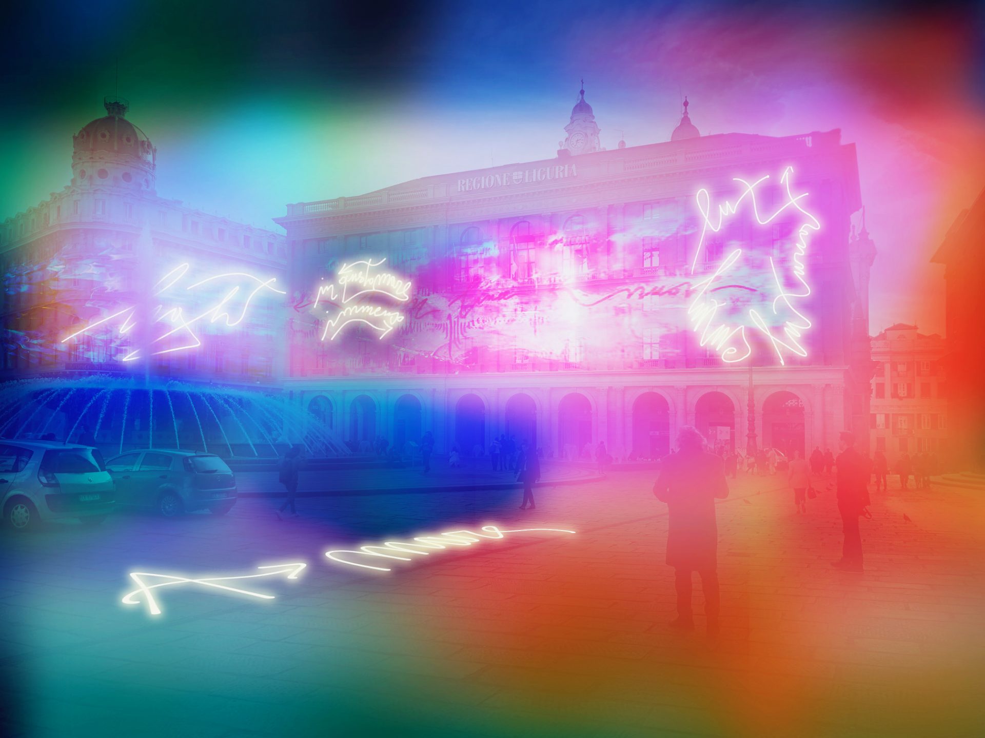Installazione luminosa di Marco Nereo Rotelli con cento poesie per Genova e dj-set di Bertallot a piazza de Ferrari e altri eventi.