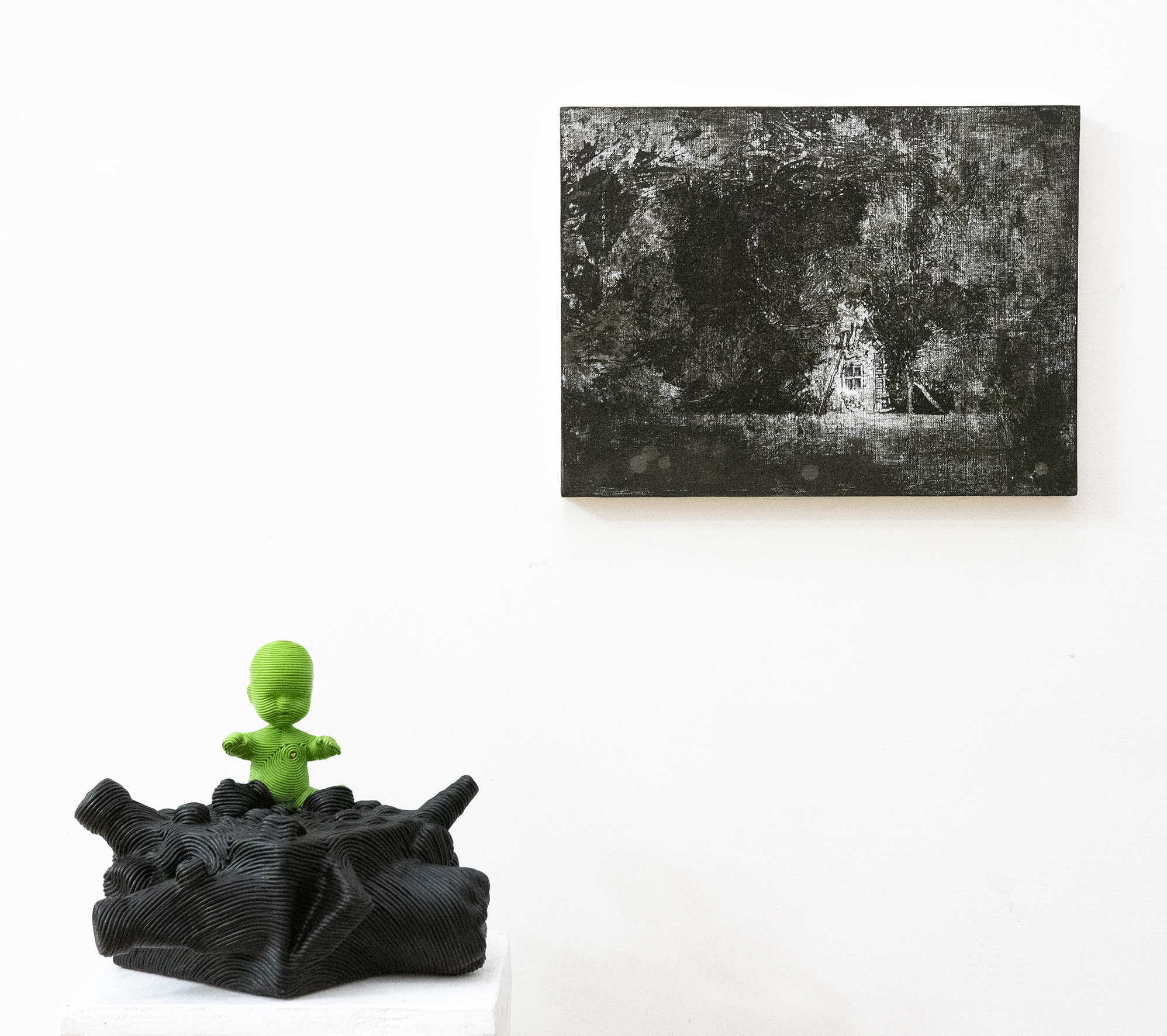 Le opere dialogano specularmente, riflettendosi le une nelle altre attraverso la materializzazione dei sogni, dei ricordi, degli sguardi dei due protagonisti del romanzo, fino a fondersi in un’installazione site-specific: un carrello fossile, surrogato di una casa distrutta, di un’esistenza incerta.
