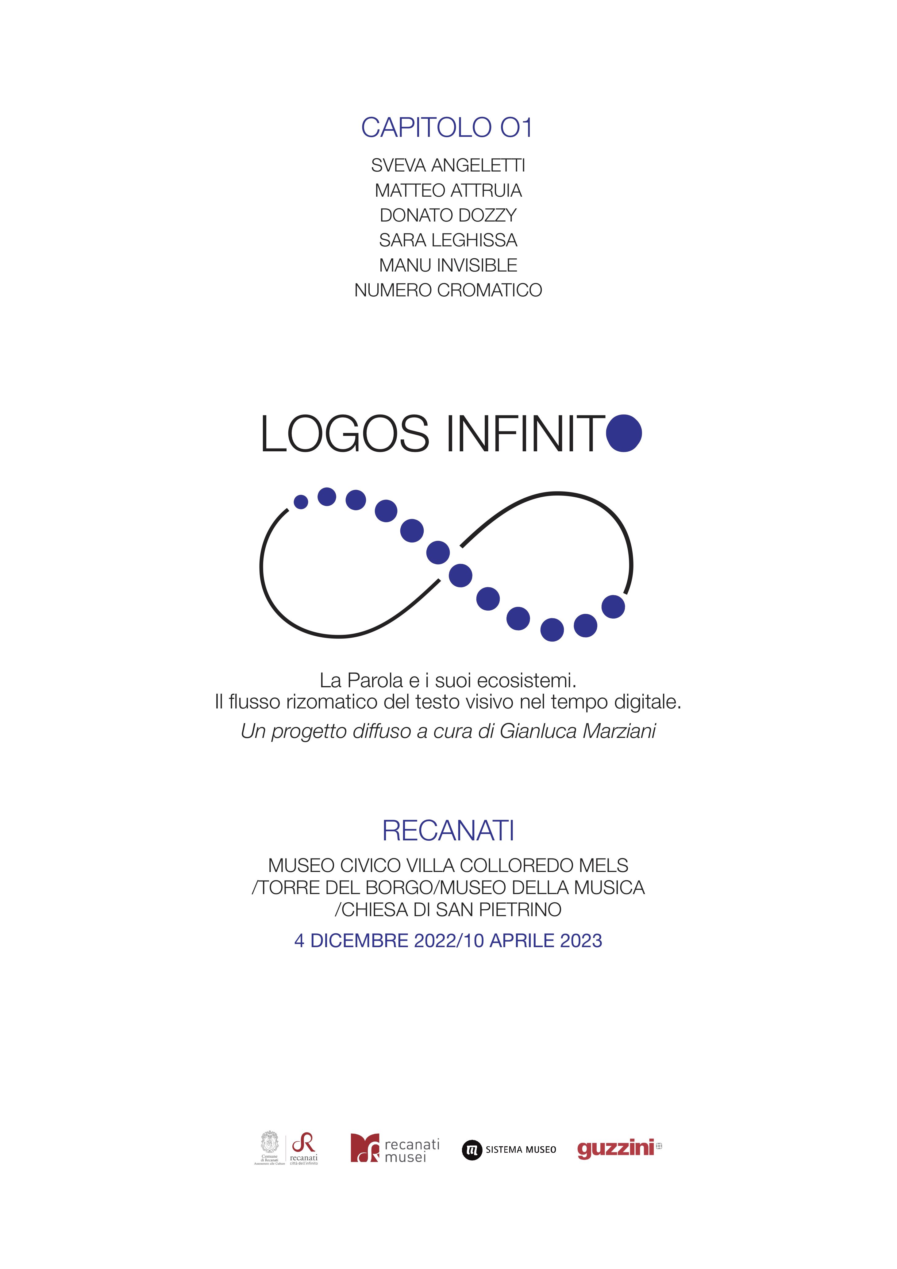In questo primo capitolo di Logos Infinito (4 dicembre 2022/10 aprile 2023) sono sei gli artisti selezionati da Marziani per la relizzazione dei vari interventi: Sveva Angeletti - Matteo Attruia - Donato Dozzy - Sara Leghissa - Manu Invisible - Numero Cromatico; quattro invece i siti interessati, ovvero tutte le strutture che compongono il circuito museale civico “Infinito Recanati”: Museo Civico Villa Colloredo Mels, MUM - Museo della Musica, Torre del Borgo, Chiesa di San Pietrino (c/o Ufficio Turistico).