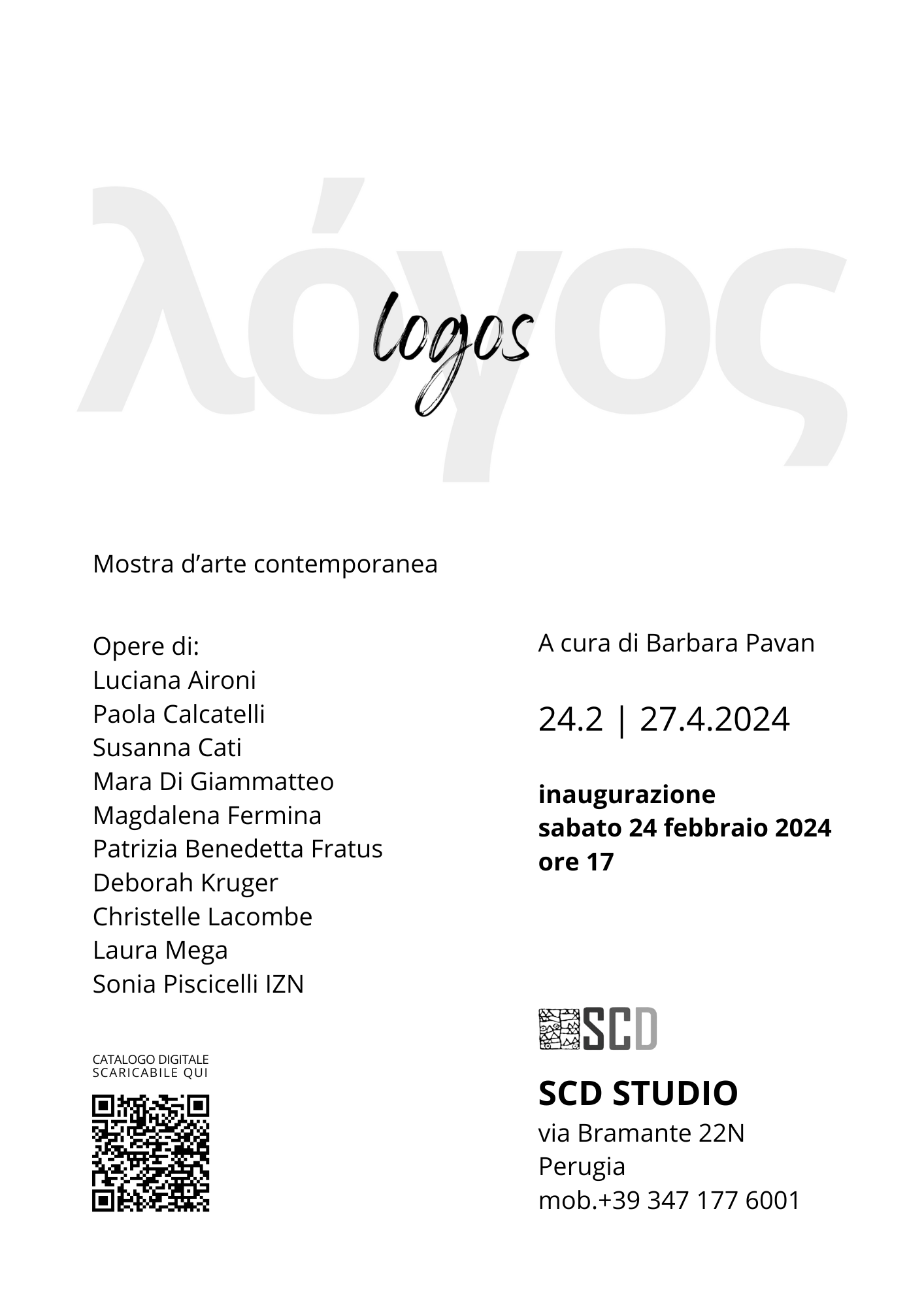 SCD Studio apre la stagione espositiva 2024 con LOGOS, una mostra d’arte contemporanea a cura di Barbara Pavan, con opere di Luciana Aironi, Paola Calcatelli, Susanna Cati, Mara Di Giammatteo, Magdalena Fermina, Patrizia Benedetta Fratus, Deborah Kruger, Christelle Lacombe, Laura Mega, Sonia Piscicelli Izn che inaugura sabato 24 febbraio 2024, ore 17, negli spazi di via Bramante 22N a Perugia.