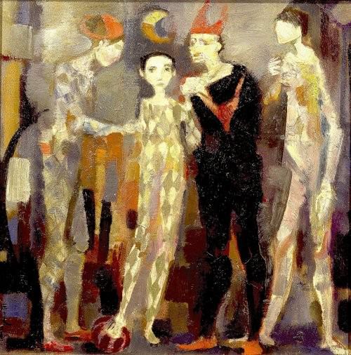 Ecco l’Arlecchino per il quale la maschera è un espediente quotidiano che permette di preservare i propri sentimenti dal contatto con un mondo ostile. Ecco il venditore di violini, viole e contrabbassi, incongrui simboli di spensieratezza e svago, ma forse anche reminiscenze delle Vanitas secentesche, moniti al carattere transitorio della felicità umana. E, ancora, il musicante, il cieco, lo zingaro, o semplicemente l’uomo solo con la sua angoscia. Infine le figure femminili: donne che subiscono le conseguenze della guerra degli uomini, madri-Madonne il cui corpo sembra fondersi nell’abbraccio con quello del bambino, metafora di una speranza mai estinta con la sua veste azzurra o rosa e il viso sereno, paffuto, ingenuo perché ancora non ha fatto esperienza del male del mondo. Longaretti descrive le figure con pennellate corpose, rapide e brevi (talvolta, il segno risente della pressione emotiva e si arrovella al punto da perdere la sua qualità figurativa per diventare astratto). Ne accenna i volti con sprazzi di luce e ombre profonde. Le staglia contro fondi grigi, viola e rosso magenta, o gialli e brillanti come l’oro.