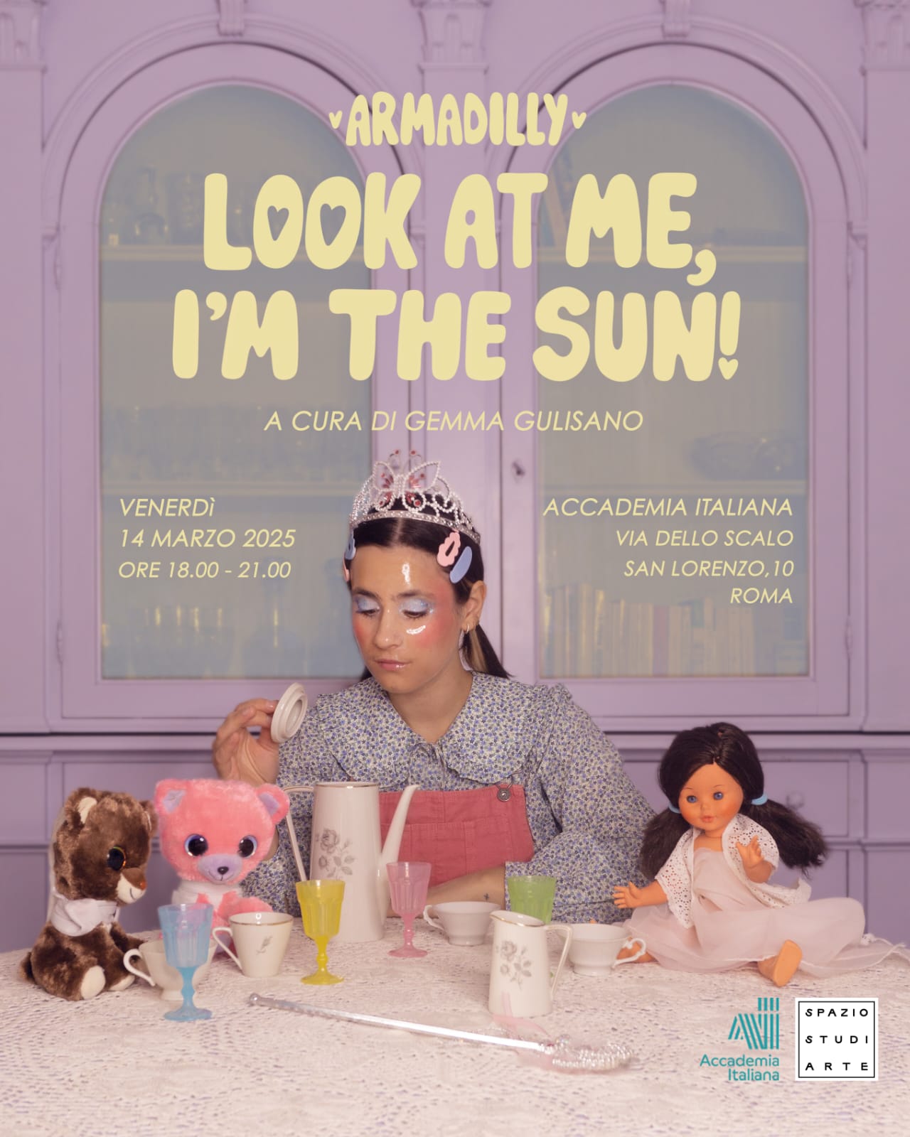 Roma, 14 marzo – 11 aprile 2025 Accademia Italiana, in collaborazione con Spazio Studi Arte, inaugura la mostra personale di Armadilly, artista emergente nel panorama contemporaneo, dal titolo "Look at me, I am the sun!", a cura di Gemma Gulisano. L’esposizione, che aprirà al pubblico dal 14 marzo all’11 aprile 2025, sarà ospitata negli spazi espositivi della sede di Roma dell’Accademia, via dello Scalo San Lorenzo 10, con vernissage il 14 marzo dalle ore 18:00 alle 21:00.