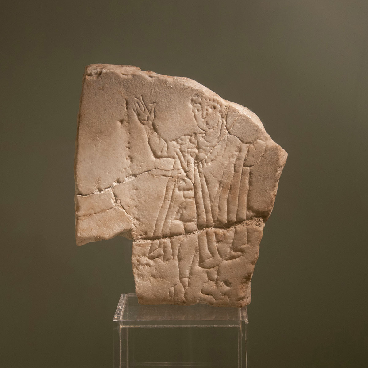 L’esposizione muove dal frammento di un’epigrafe funeraria paleocristiana, rinvenuta nell’area del cimitero nel Complesso Monumentale di Sant’Eustorgio, raffigurante un defunto, con le braccia allargate e innalzate nell’atteggiamento dell’orante.
