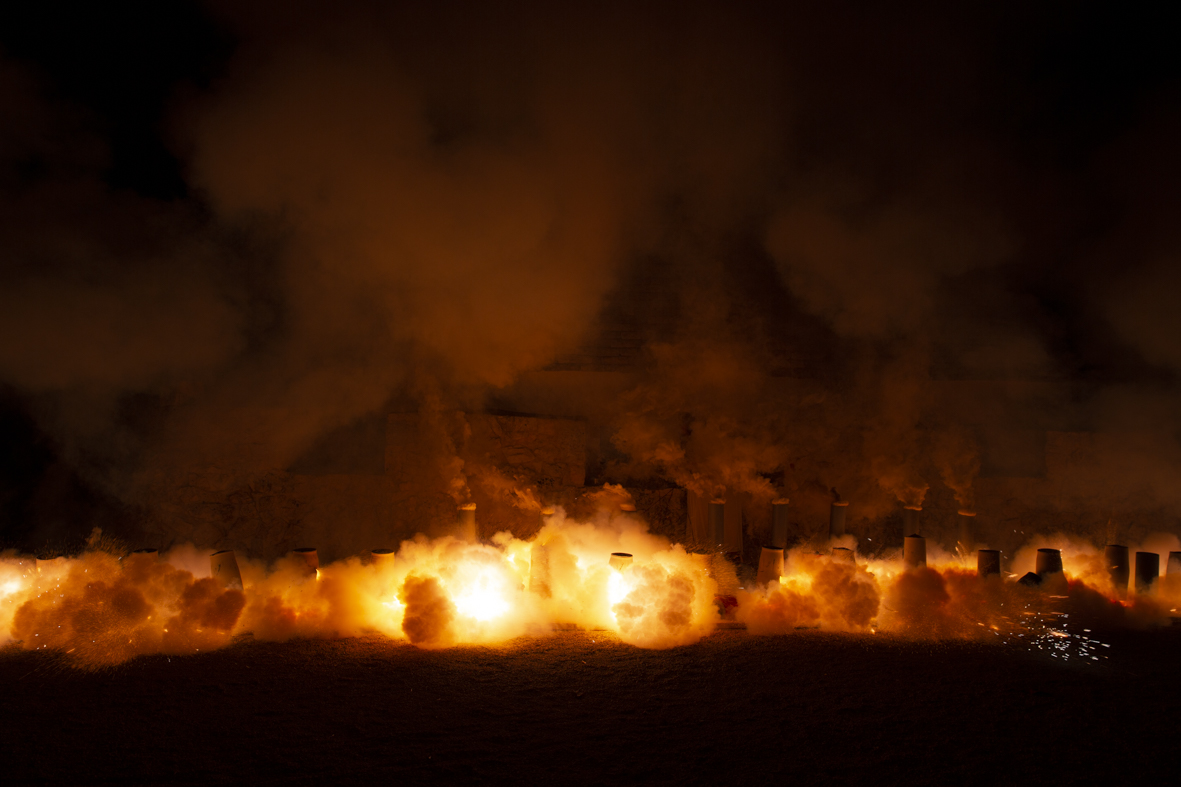 Ed è forse questo l’elemento più dirompente nel lavoro di Loredana Longo: perché nulla della violenza che ci circonda viene proposto letteralmente. Lo spettacolo pirotecnico dell’esplosione non è didascalico: non vediamo un’esecuzione davanti ai nostri occhi. Eppure vediamo un’esplosione, ne percepiamo la detonazione, vediamo collassare davanti a noi decine di cilindri in argilla fresca, disposti in file regolari.