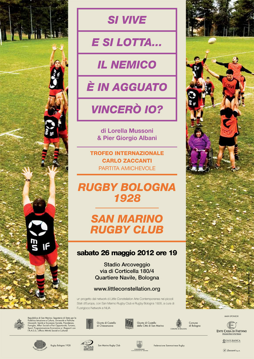Con il progetto “Si vive e si lotta il nemico è in agguato… vincerò io?” Lorella Mussoni, che da anni lotta contro la Sclerosi multipla, pone con intensità l’attenzione sulla centralità del rapporto tra individuo e spazio sociale, contro ogni forma di limitazione che la malattia impone. In questa particolare occasione, mediante la sinergia fra il linguaggio dell'arte e il linguaggio sportivo del rugby, vuole attirare l'attenzione sull’attuale discussione e sulla contrapposizione scientifica tra le varie terapie per la cura della Sclerosi multipla, al fine di sollecitare l'avviarsi di un processo di riconciliazione per una sperimentazione dell’unificazione. Il rugby ha una caratteristica speciale rispetto ad altri sport, infatti il gioco contempla un Terzo tempo: questo non è solo un tradizionale incontro dopo gara tra i giocatori delle due squadre, ma è inteso come momento conviviale, un momento di socializzazione tra i giocatori cui spesso partecipano gli amici, le famiglie e i tifosi. Un luogo in cui s'annullano le distanze tra antagonisti, lasciando spazio a una viva e reciproca convivialità. Attraverso il Terzo tempo, e non solo in senso metaforico, si passerà dallo scontro all'arte dell'incontro, dal confronto diretto all'integrazione.