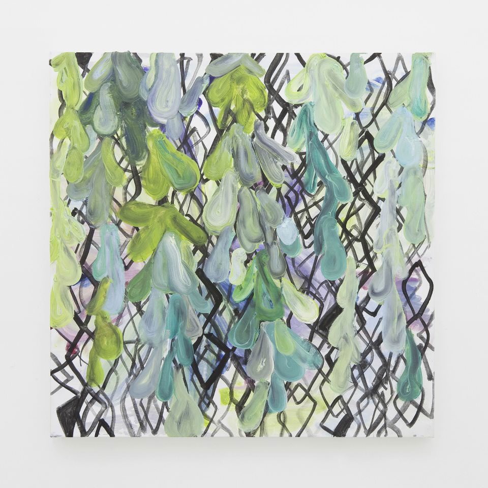 Le fragili visioni di giardini lussureggianti, abitati solo da tessiture vegetali e da figure volatili stilizzate, si delineano sulla tela con sapienti e selezionate pennellate di colore fluido. Fondi dalle serene trame acquatiche tagliati da geometrie, differenti ma complementari, ridefiniscono un vocabolario visivo del segno. L’occhio perde la percezione della figura e si sposta sul gesto, sul controllo del colore e della tonalità, delineando i confini di un astrazione latente. Tocchi cromatici si poggiano ritmici anche su fragili porcellane. Tre magmatici crateri e due mani che reggono tralci di fiori freschi fanno da contrappunto solido alla quinta vegetale.