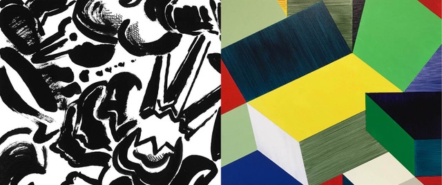 I piccoli quadri su tavola di geometria policroma di Lorenza Sannai sono alternati alle grandi carte di figurazioni dipinte da Lucio Pozzi in nero su bianco.